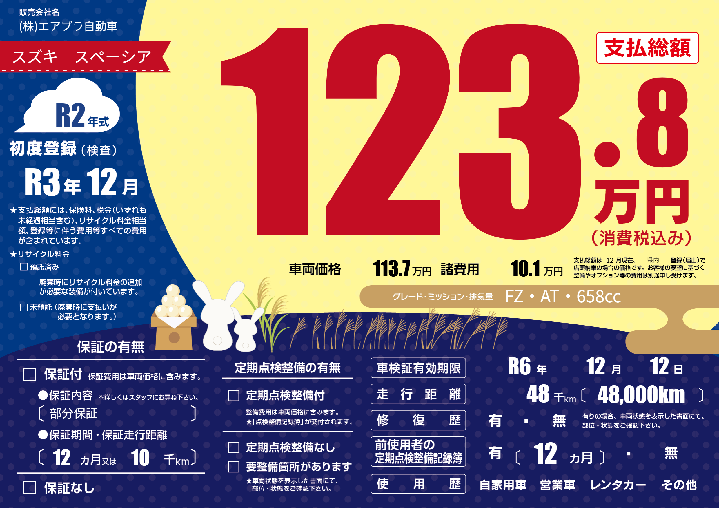 | 車名 | スズキ スペーシア | グレード ミッション 排気量 |