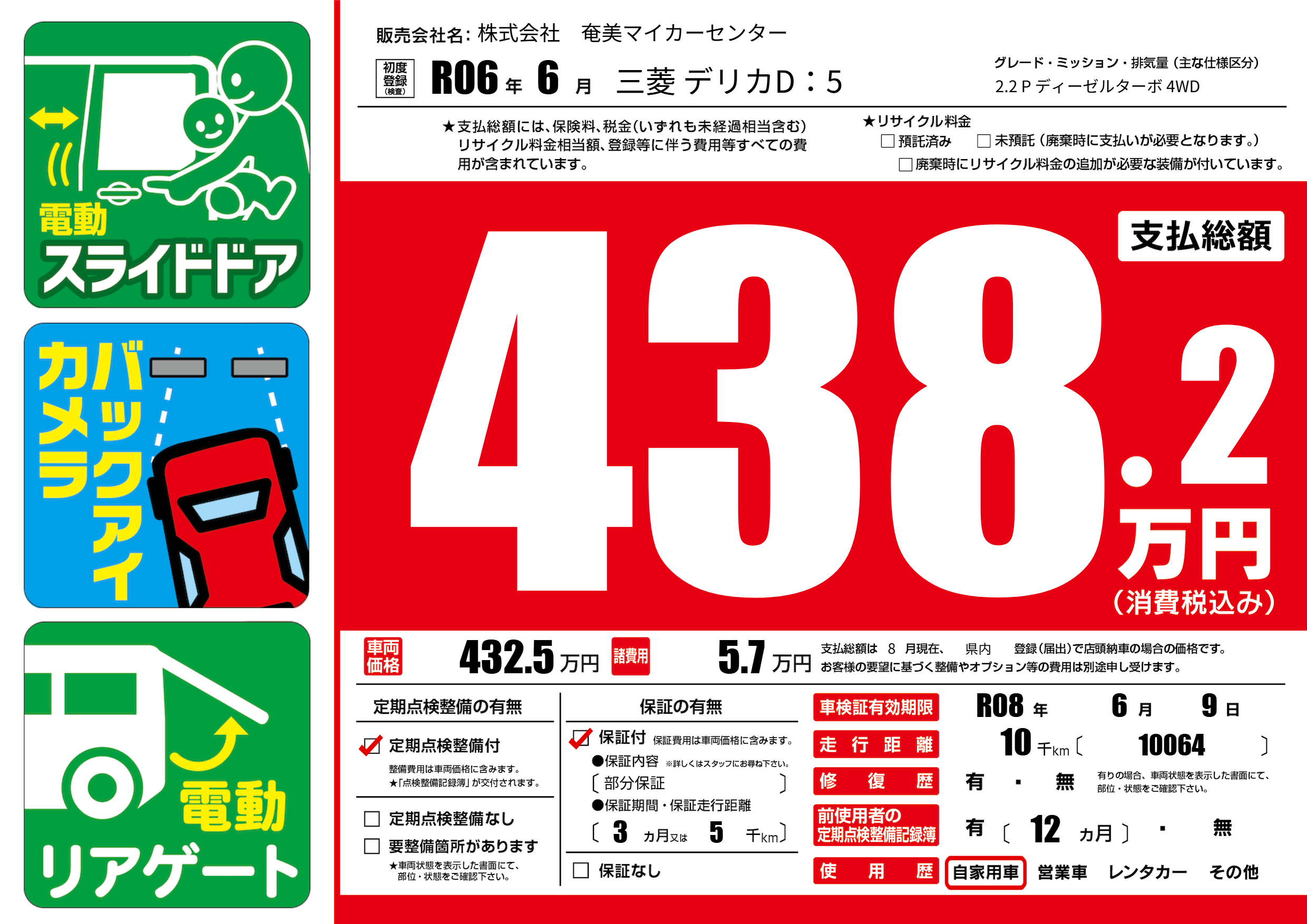 | 車名 | 三菱 デリカD:5 | グレード ミッション 排気量 |