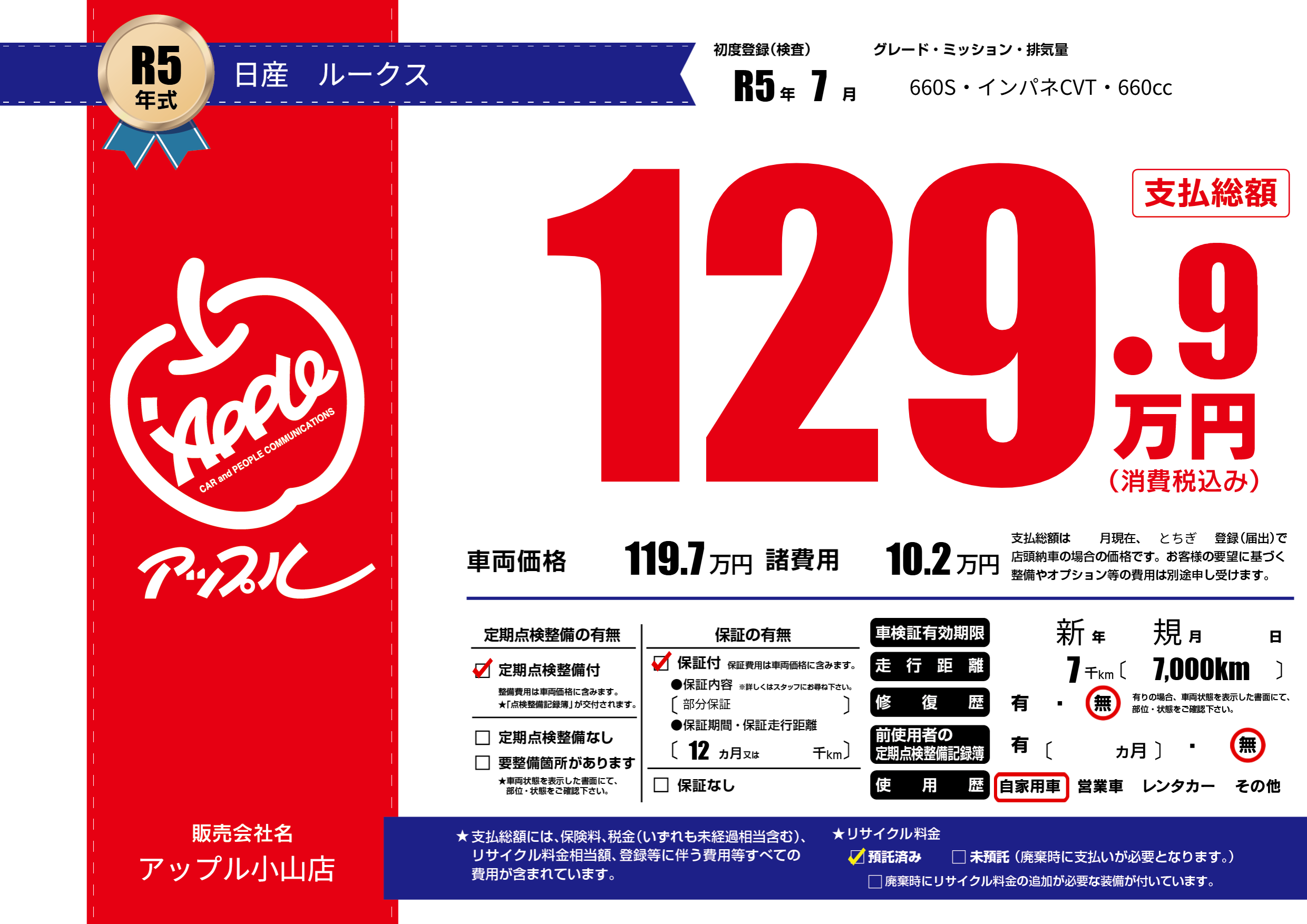 | 走行キロ | 0.7万km | 初年度登録 | R5年7月 |