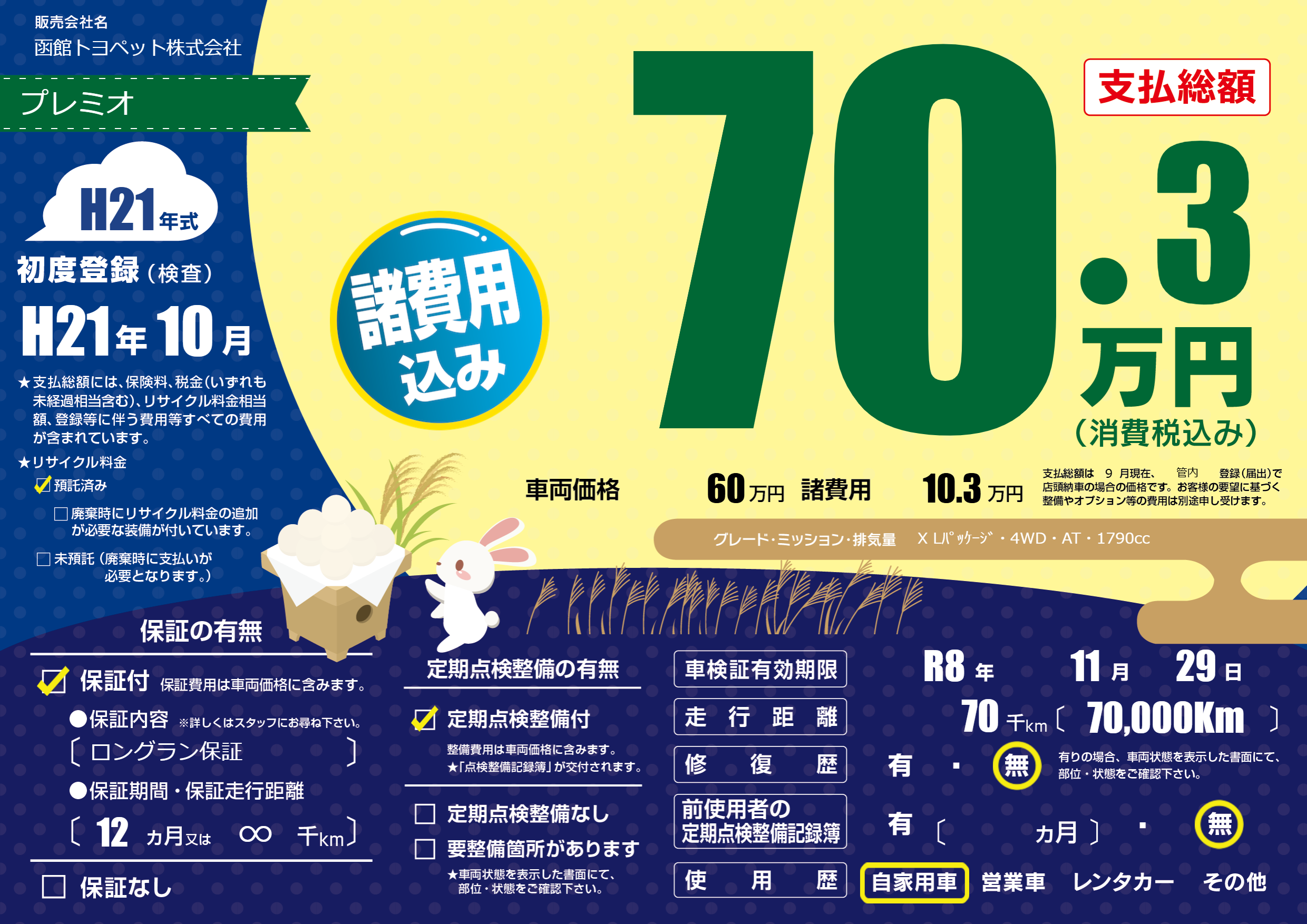 | 走行キロ | 7万km | 初年度登録 | H21年10月 |