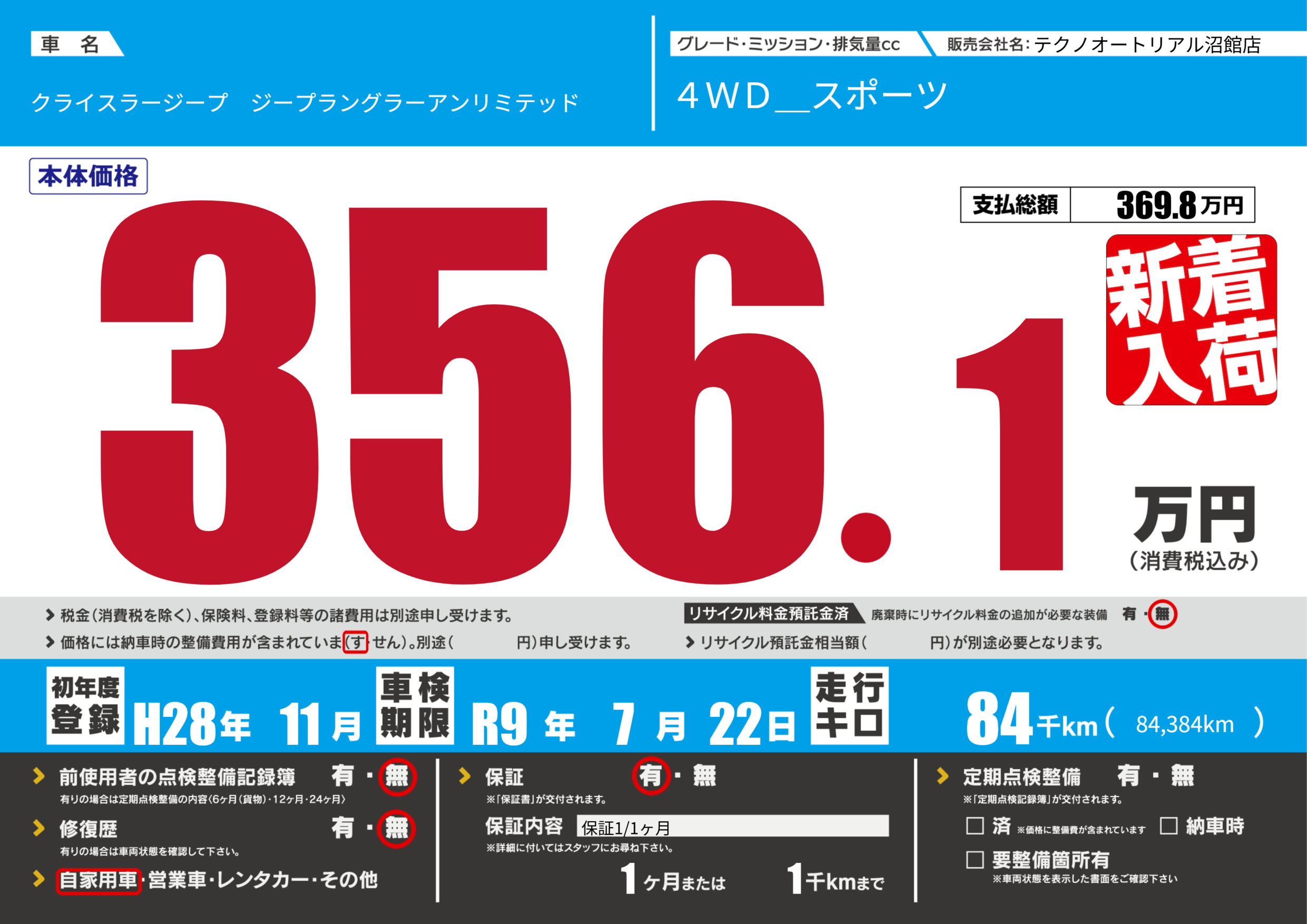 | 車名 | クライスラージープ ジープラングラーアンリミテッド | グレード ミッション 排気量 |