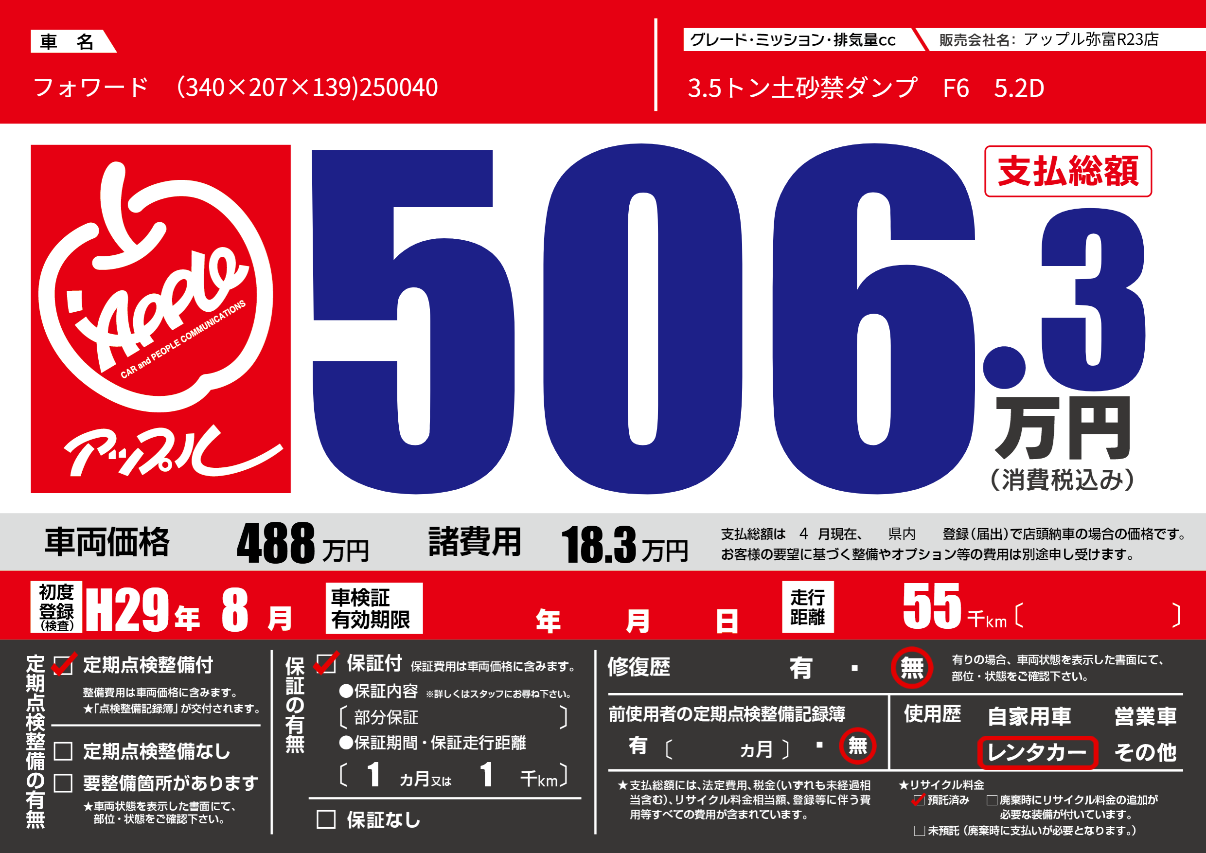 | 車名 | フォワード (340×207×139)250040 | グレード ミッション 排気量 |