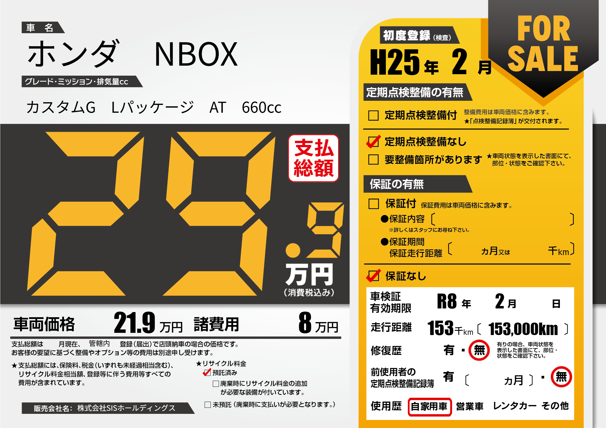 | 走行キロ | 15.3万km | 初年度登録 | H25年2月 |