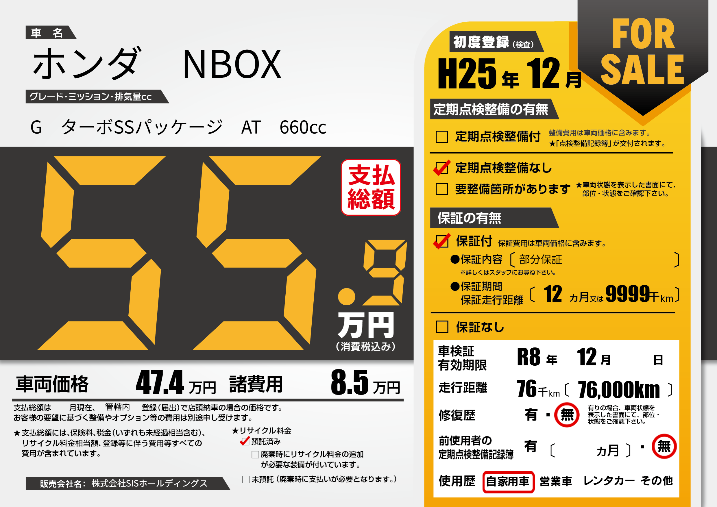 | 車名 | ホンダ NBOX | グレード ミッション 排気量 |