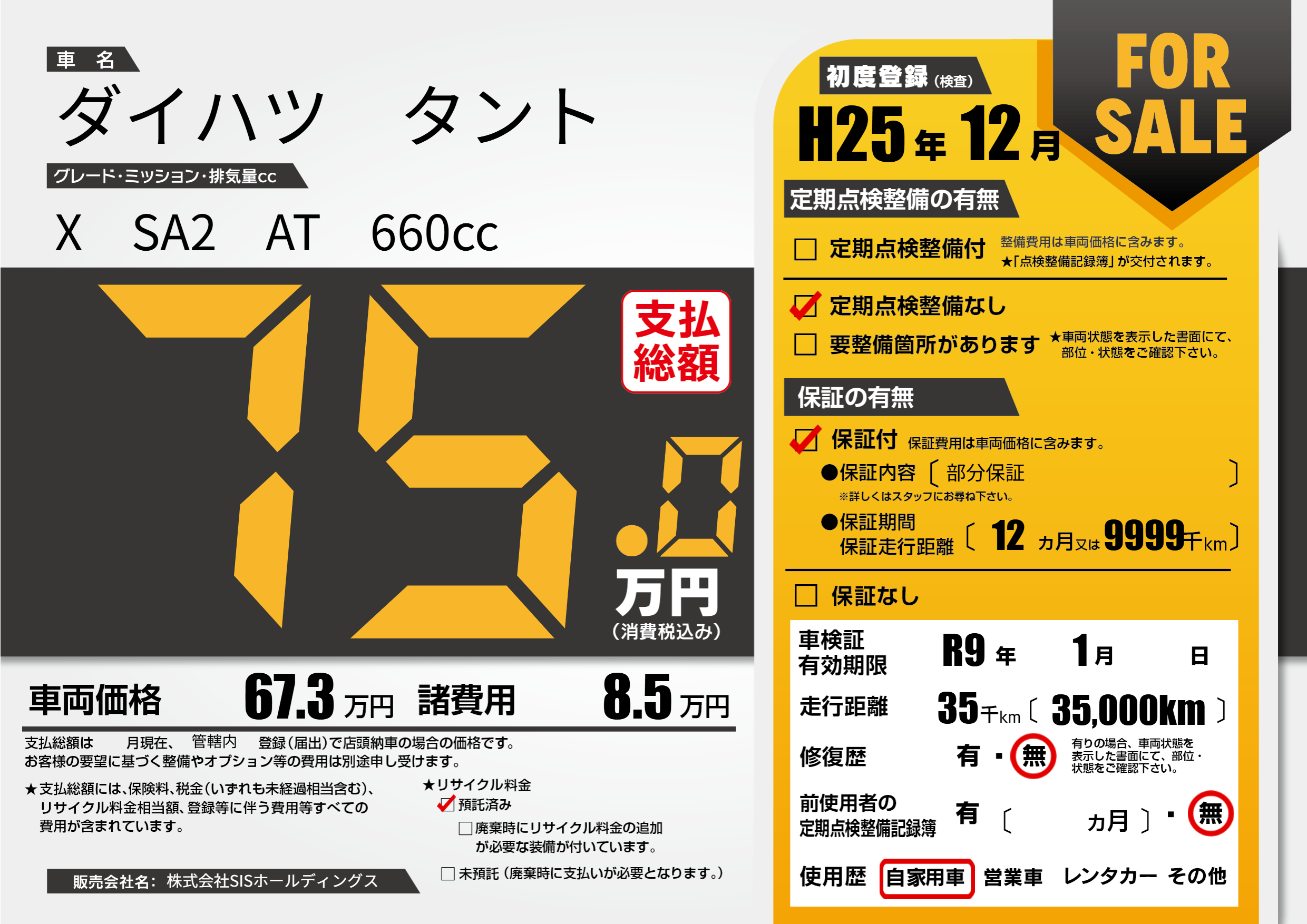 | 車名 | ダイハツ タント | グレード ミッション 排気量 |