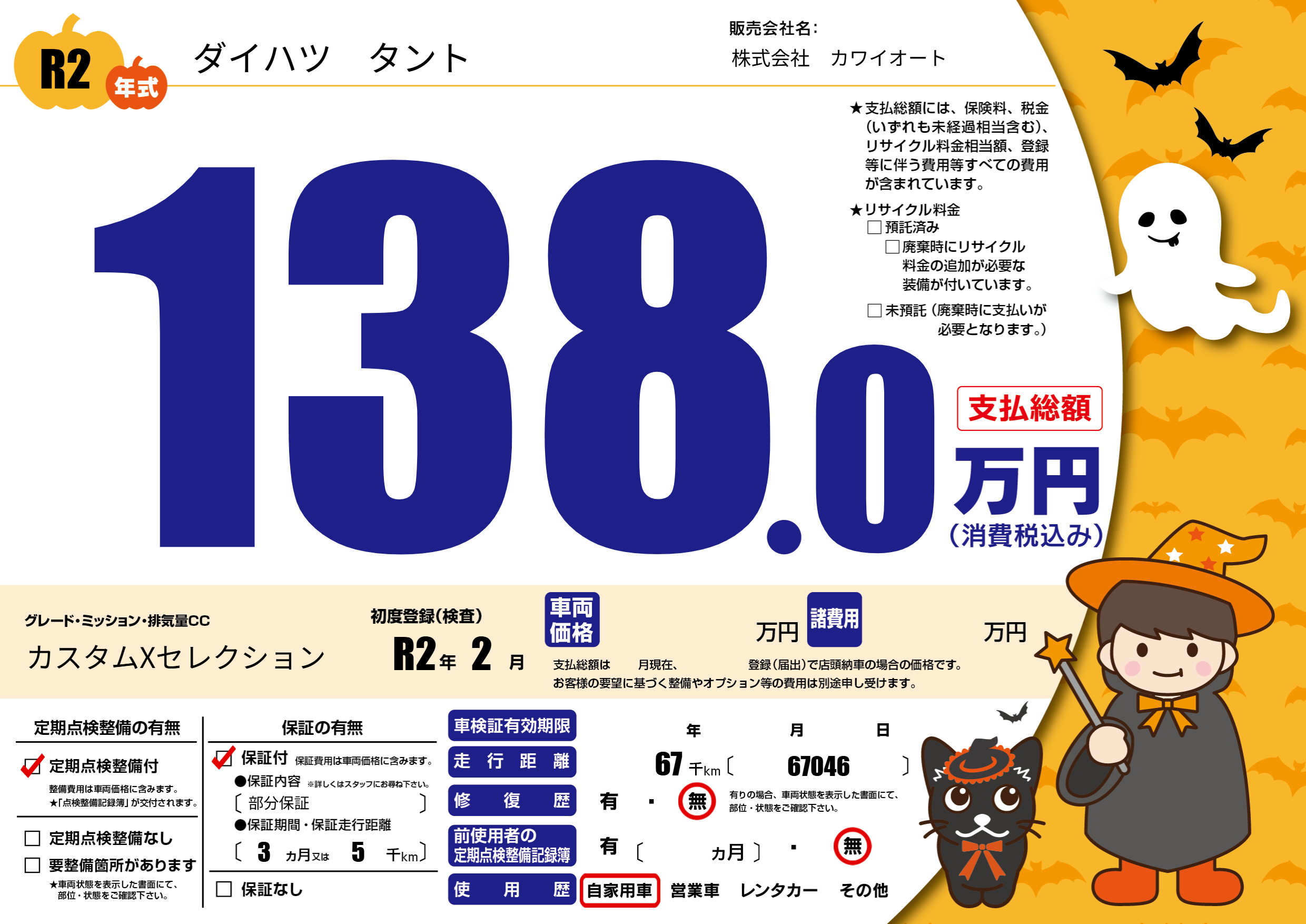 | 車名 | ダイハツ タント | グレード ミッション 排気量 |