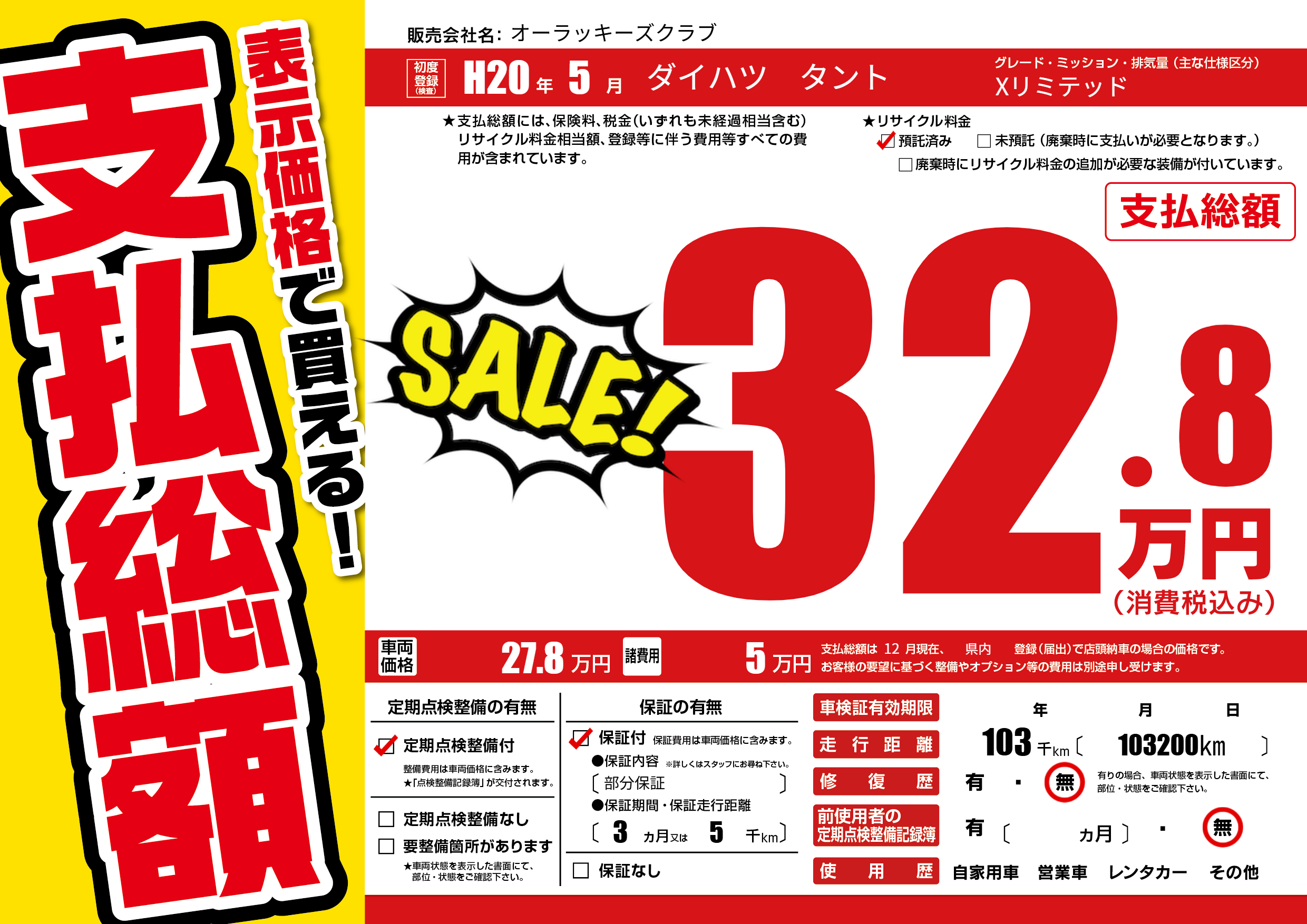 | 車名 | ダイハツ タント | グレード ミッション 排気量 |