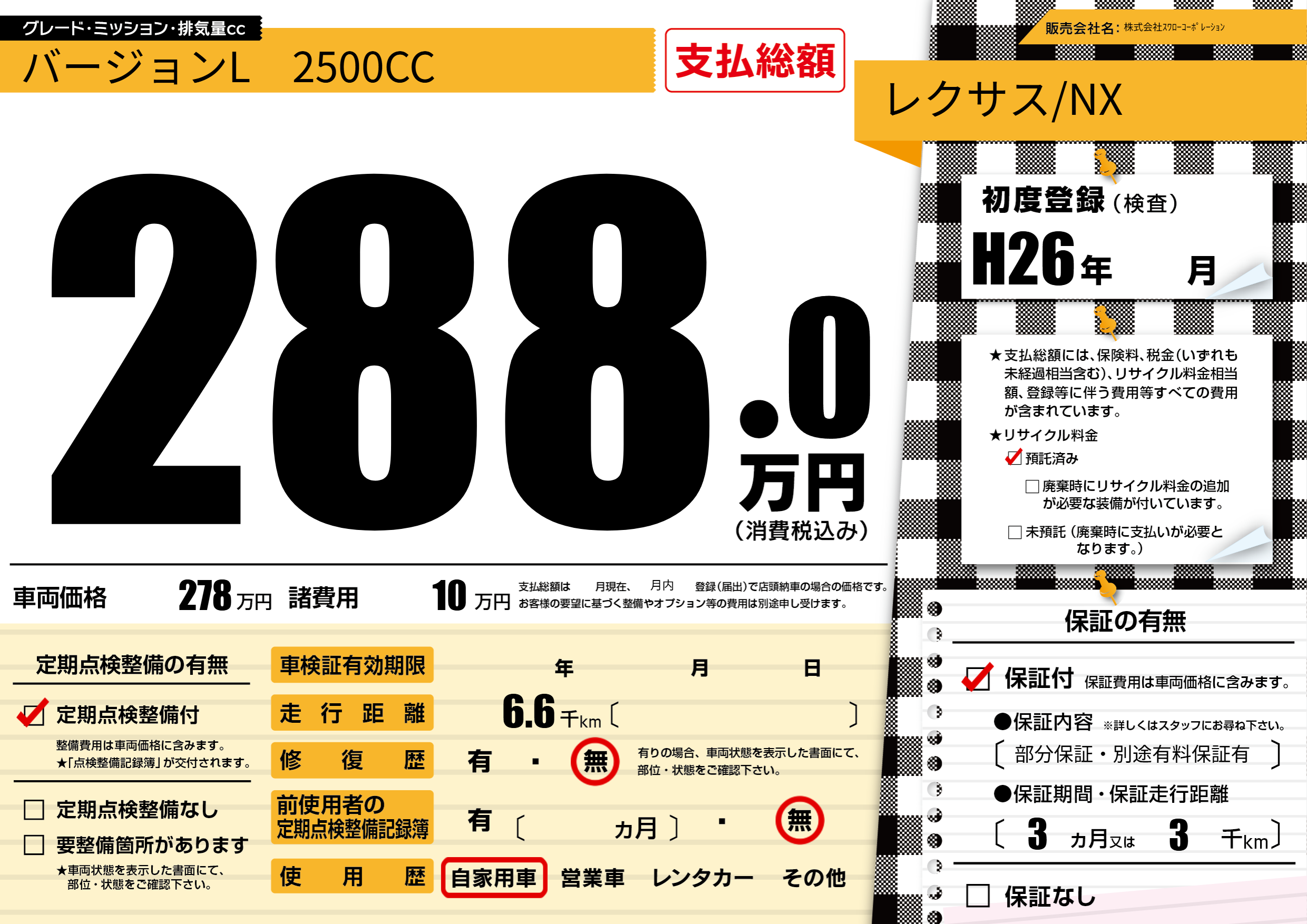 | 車名 | レクサス/NX | グレード ミッション 排気量 |