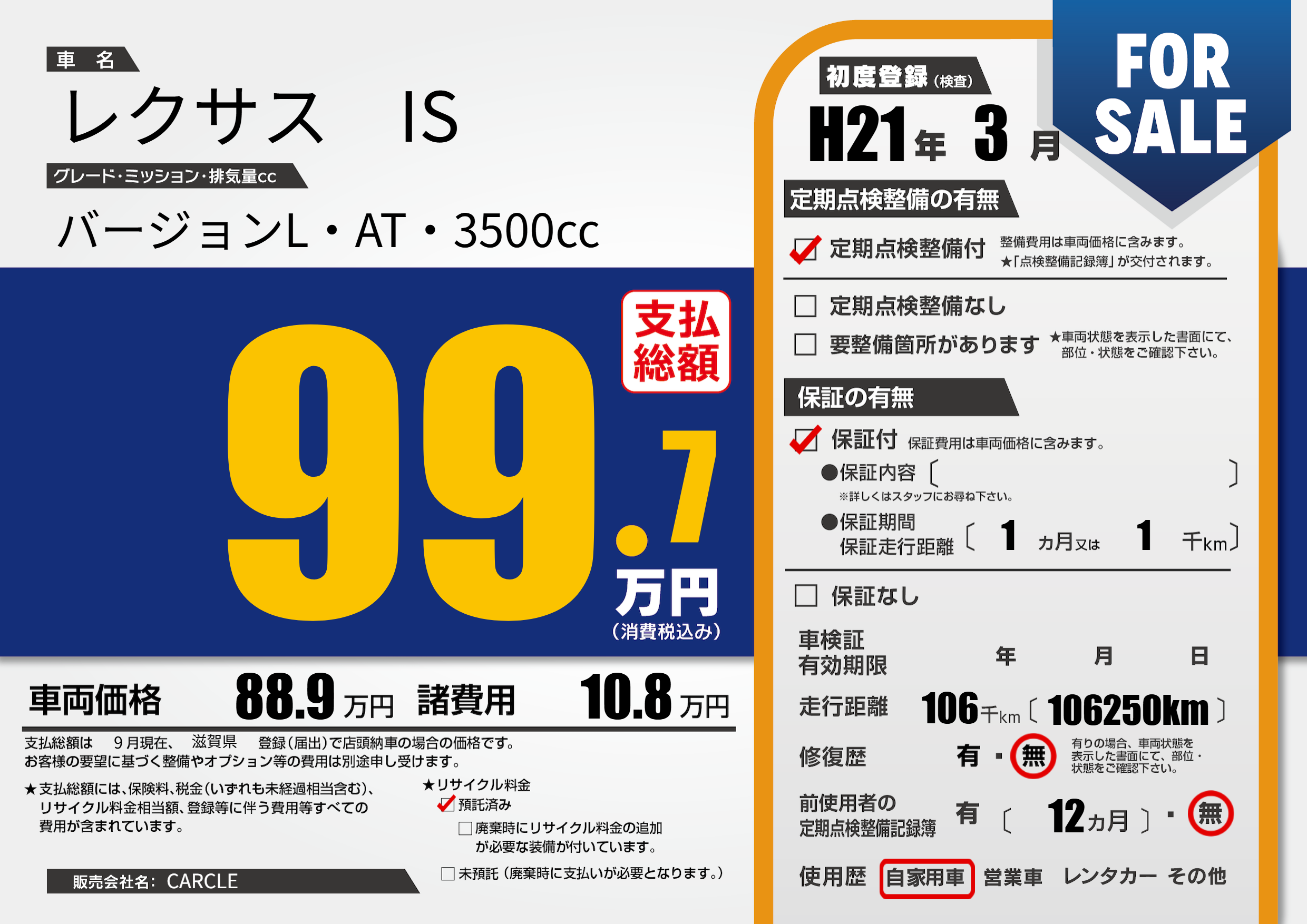 | 走行キロ | 10.6万km | 初年度登録 | H21年3月 |