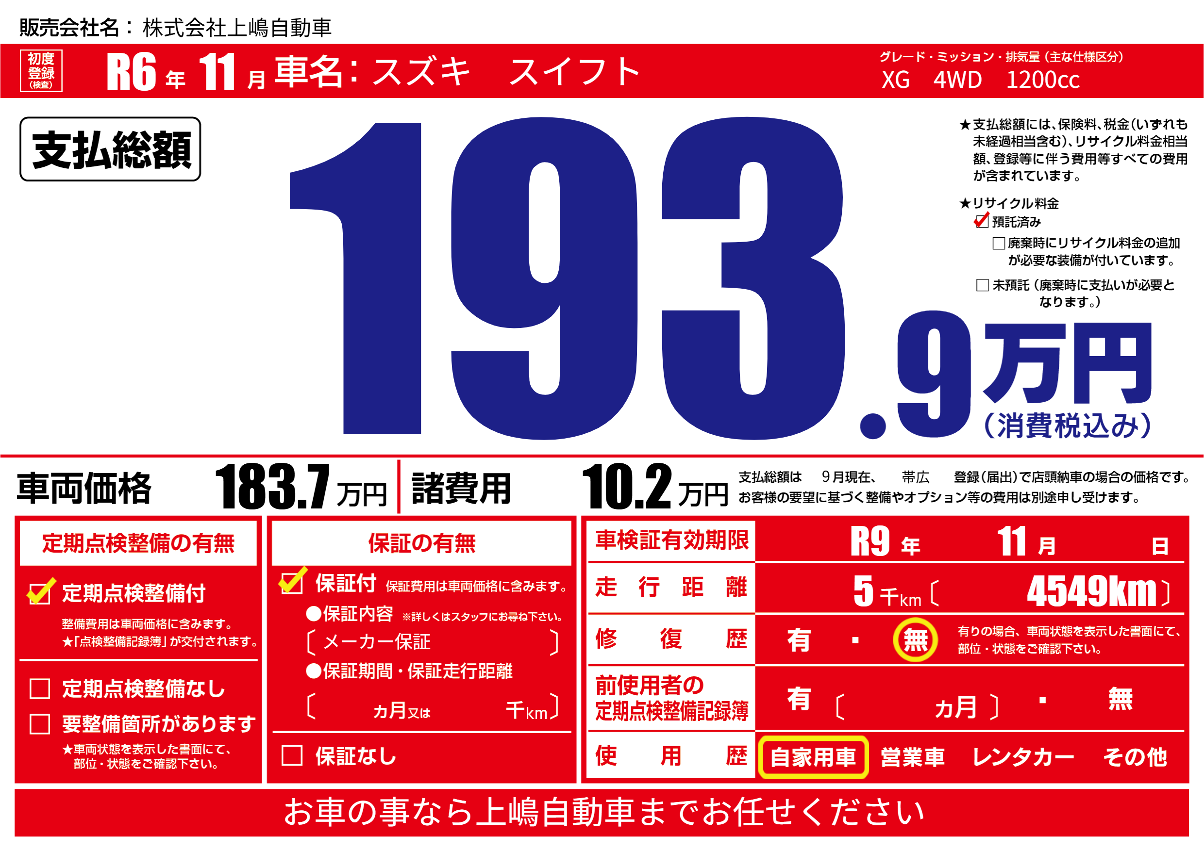 | 車名 | スズキ スイフト | グレード ミッション 排気量 |