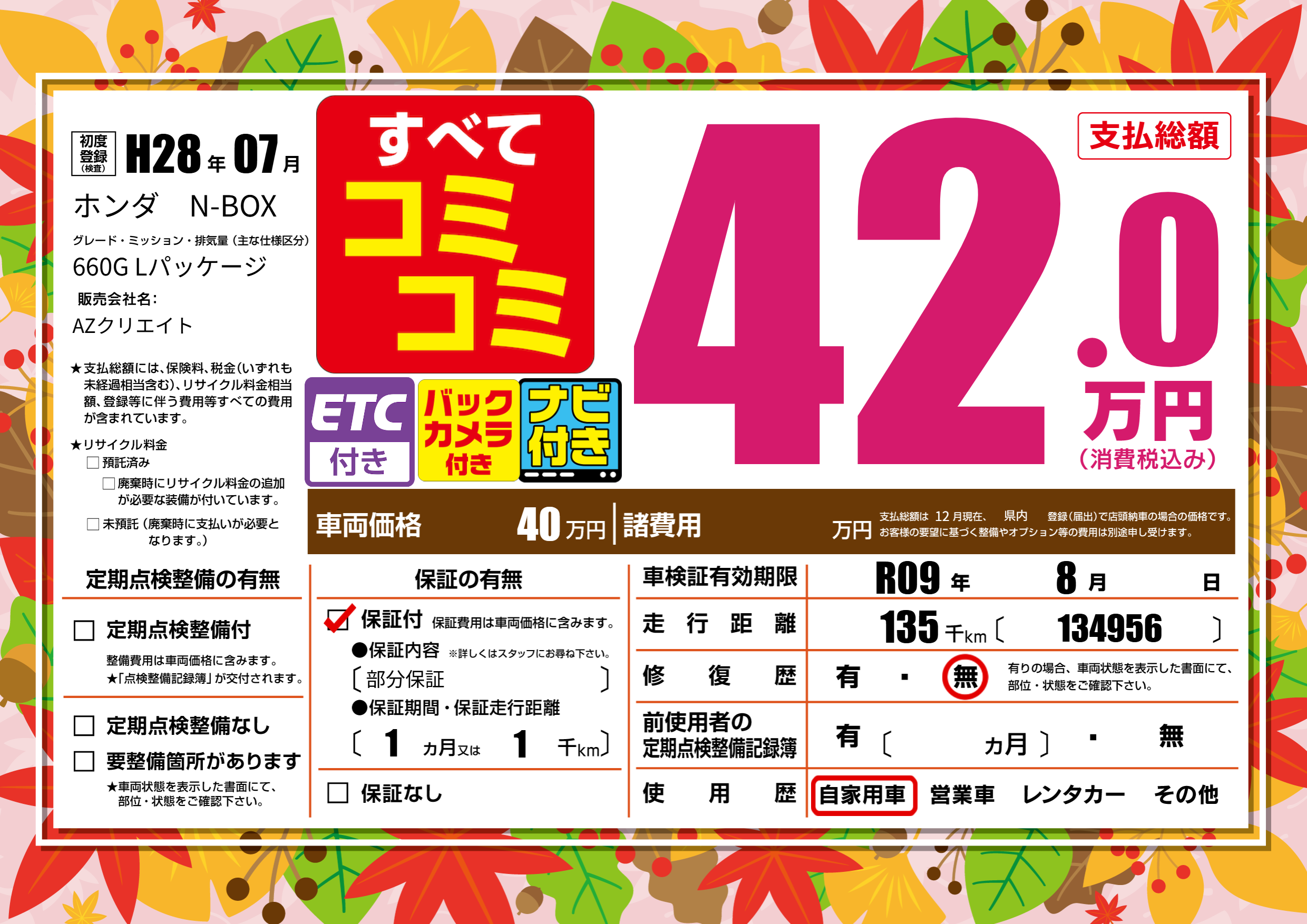 | 車検制限 | R09年 8月 - 日 | ||