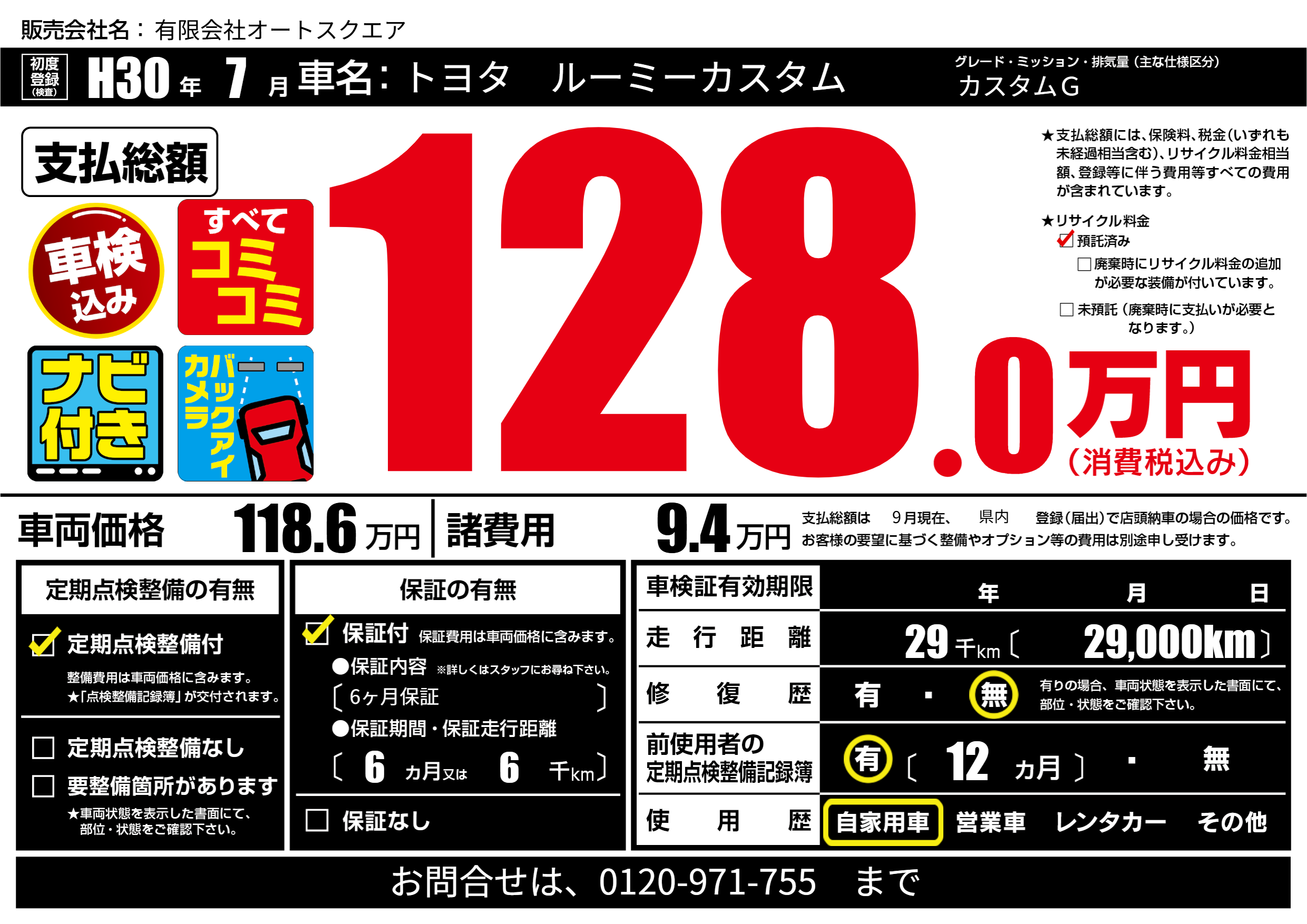 | 走行キロ | 2.9万km | 初年度登録 | H30年7月 |