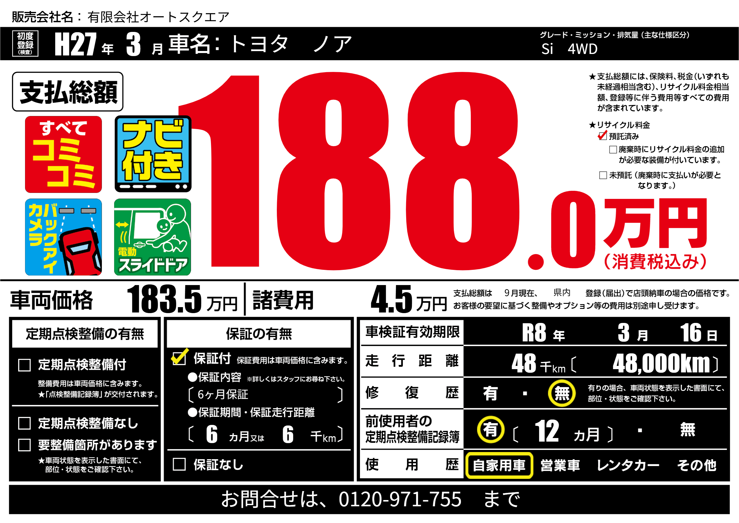 | 走行キロ | 4.8万km | 初年度登録 | H27年3月 |