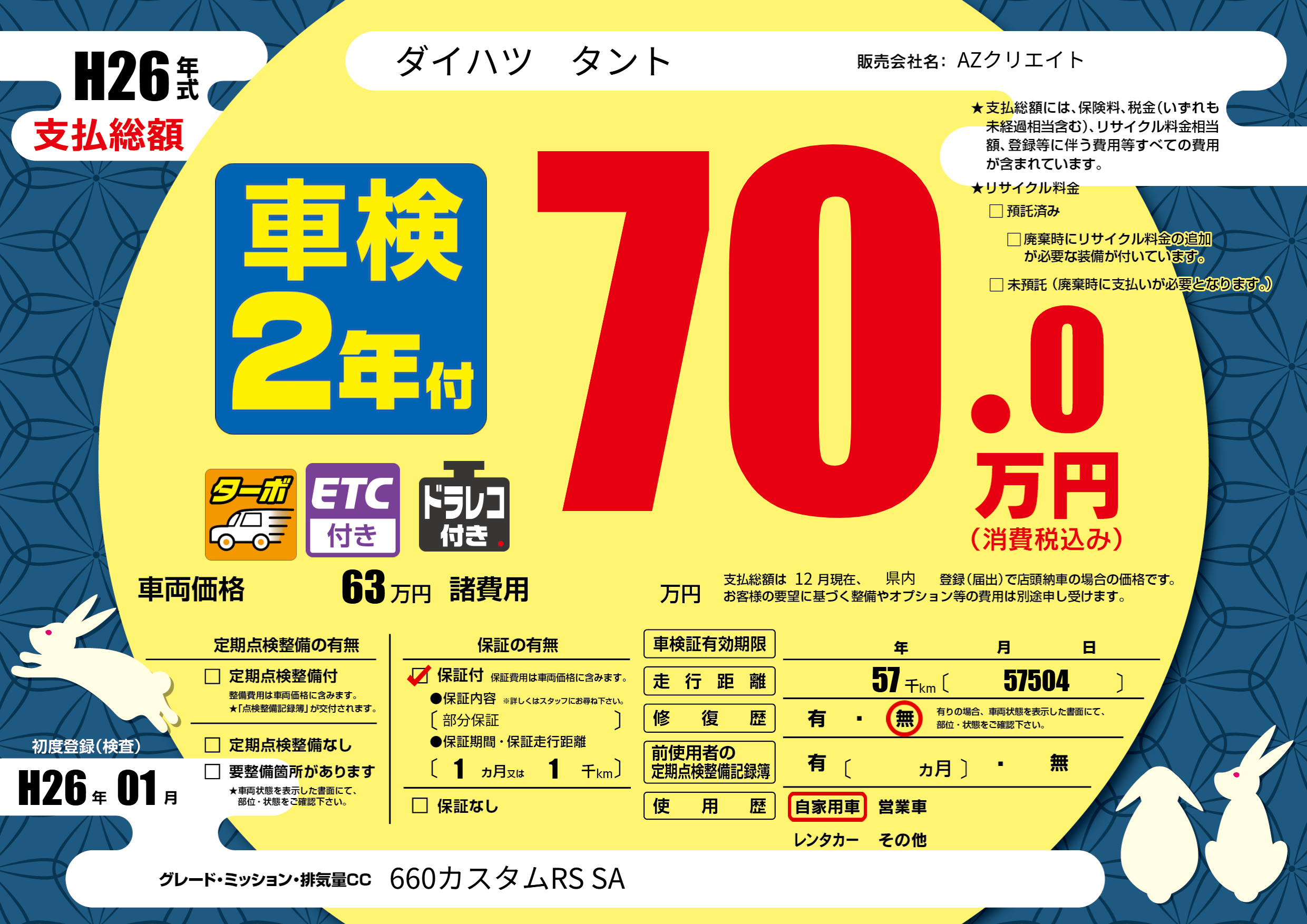 | 車名 | ダイハツ タント | グレード ミッション 排気量 |