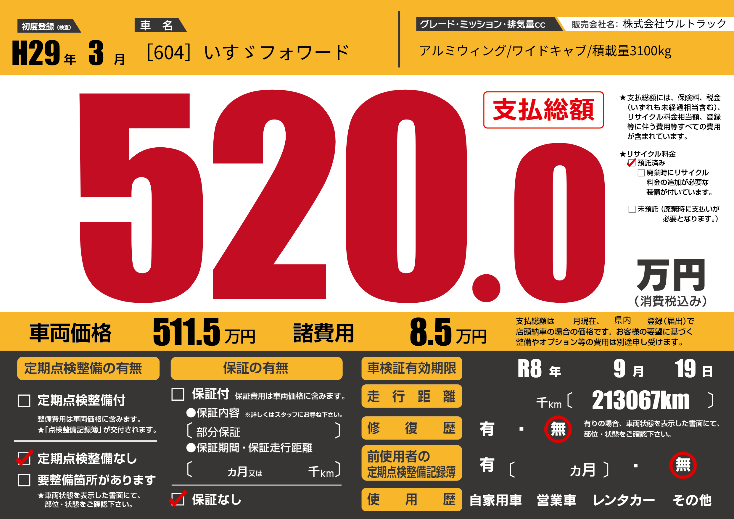 保証なし 保証内容(部分保証) ---ヶ月または()千kmまで |