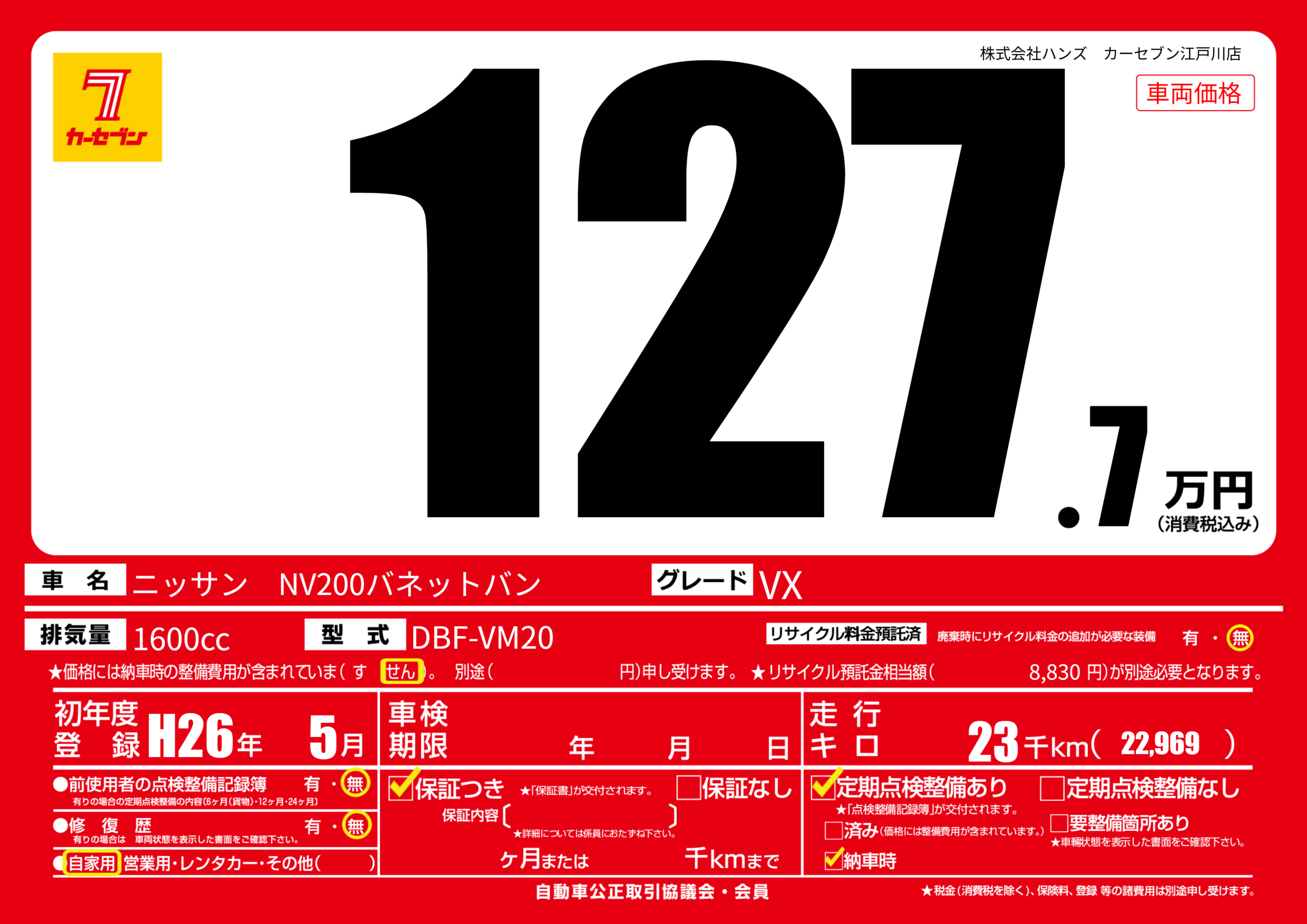 | 車名 | ニッサン NV200バネットバン | グレード ミッション 排気量 |