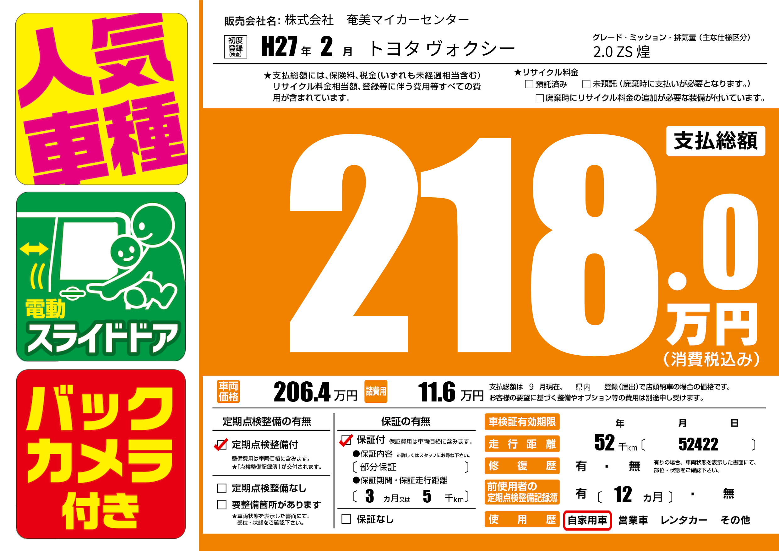 | 走行キロ | 5.2万km | 初年度登録 | H27年2月 |