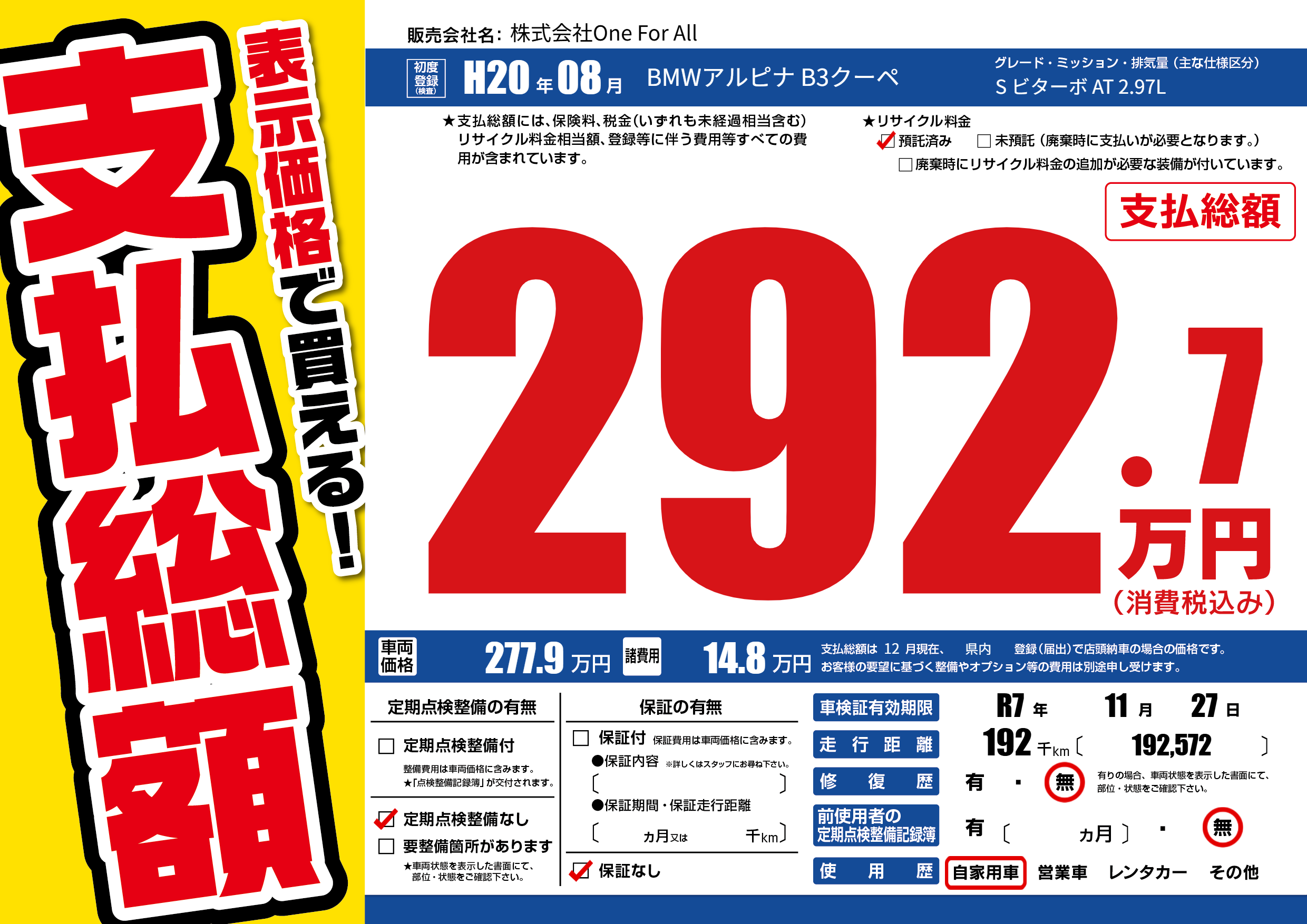 | 車名 | BMWアルピナ B3クーペ | グレード ミッション 排気量 |