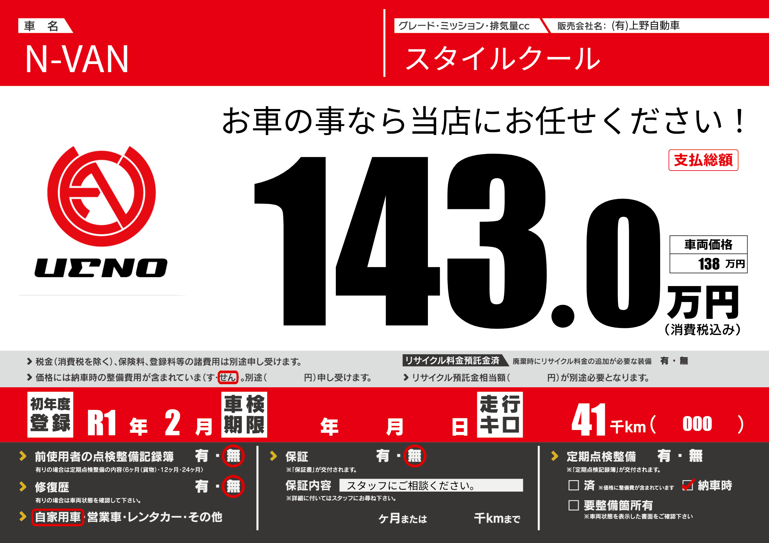 | 車名 | N-VAN | グレード ミッション 排気量 |
