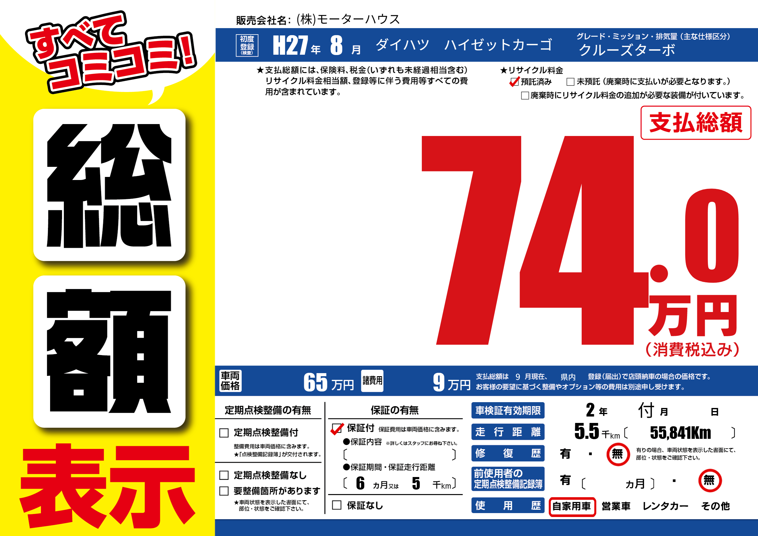 | 車名 | ダイハツ ハイゼットカーゴ | グレード ミッション 排気量 |