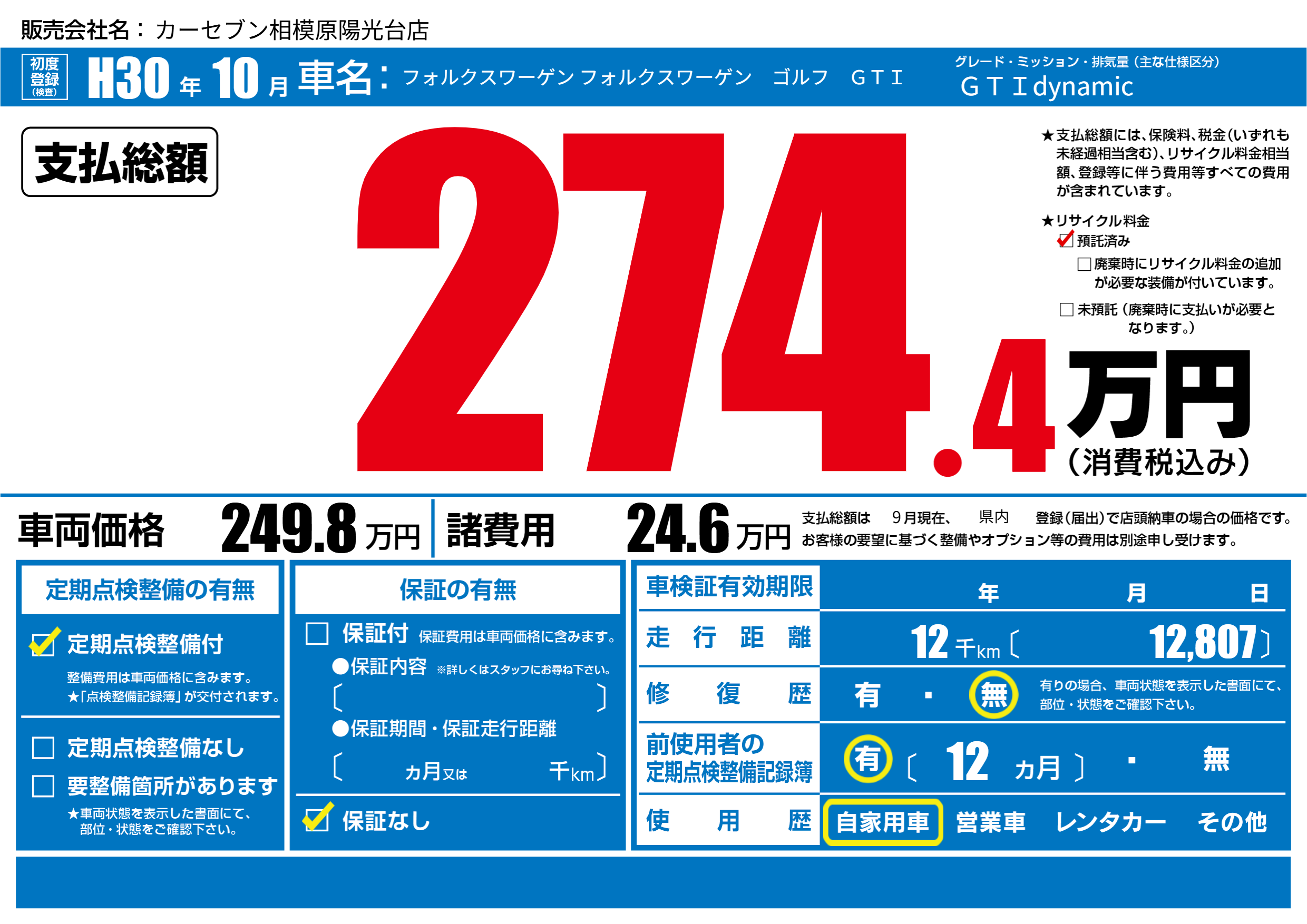 | 車名 | フォルクスワーゲン フォルクスワーゲン ゴルフ GTI | グレード ミッション 排気量 |