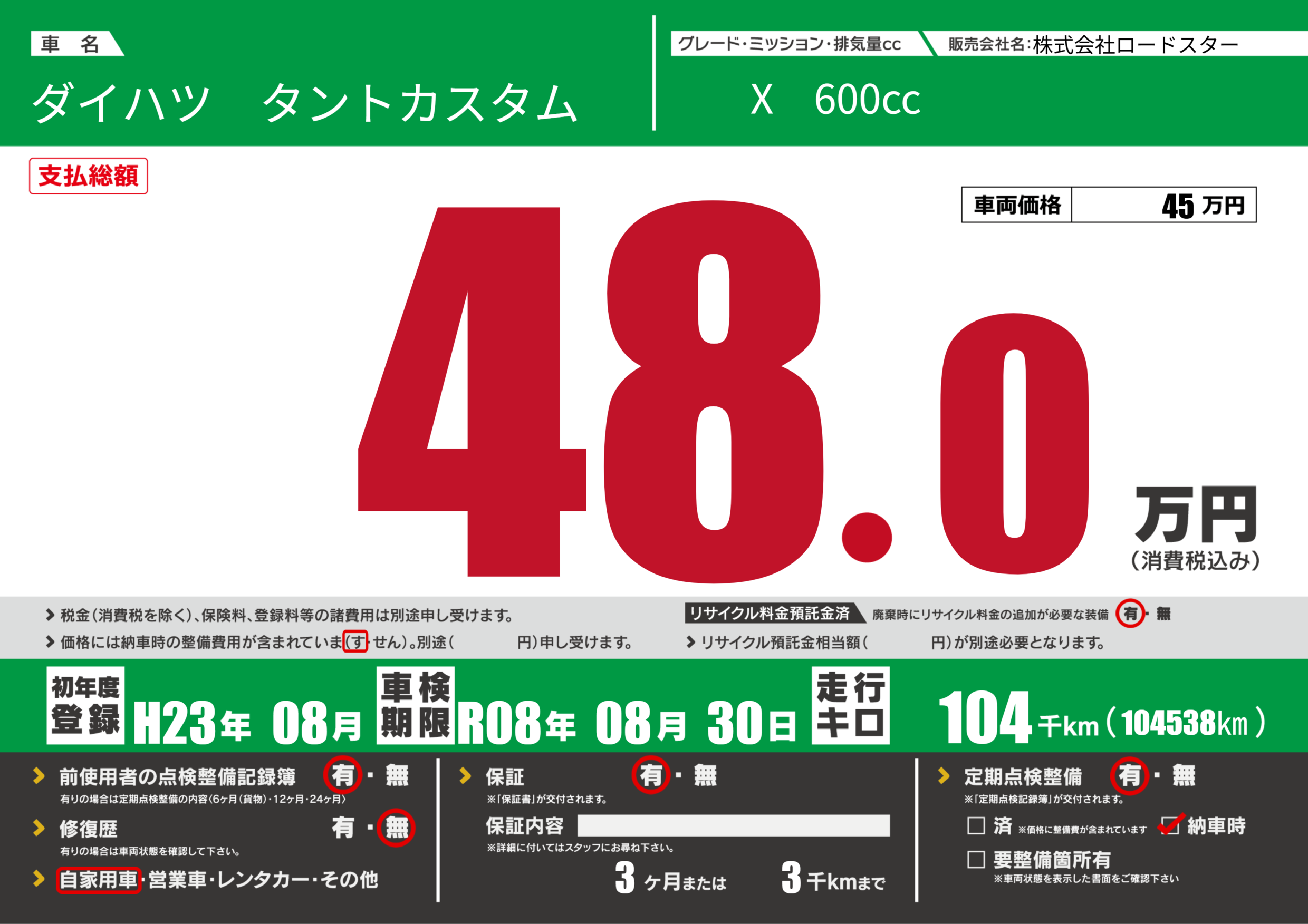 | 走行キロ | 10.4万km | 初年度登録 | H23年08月 |