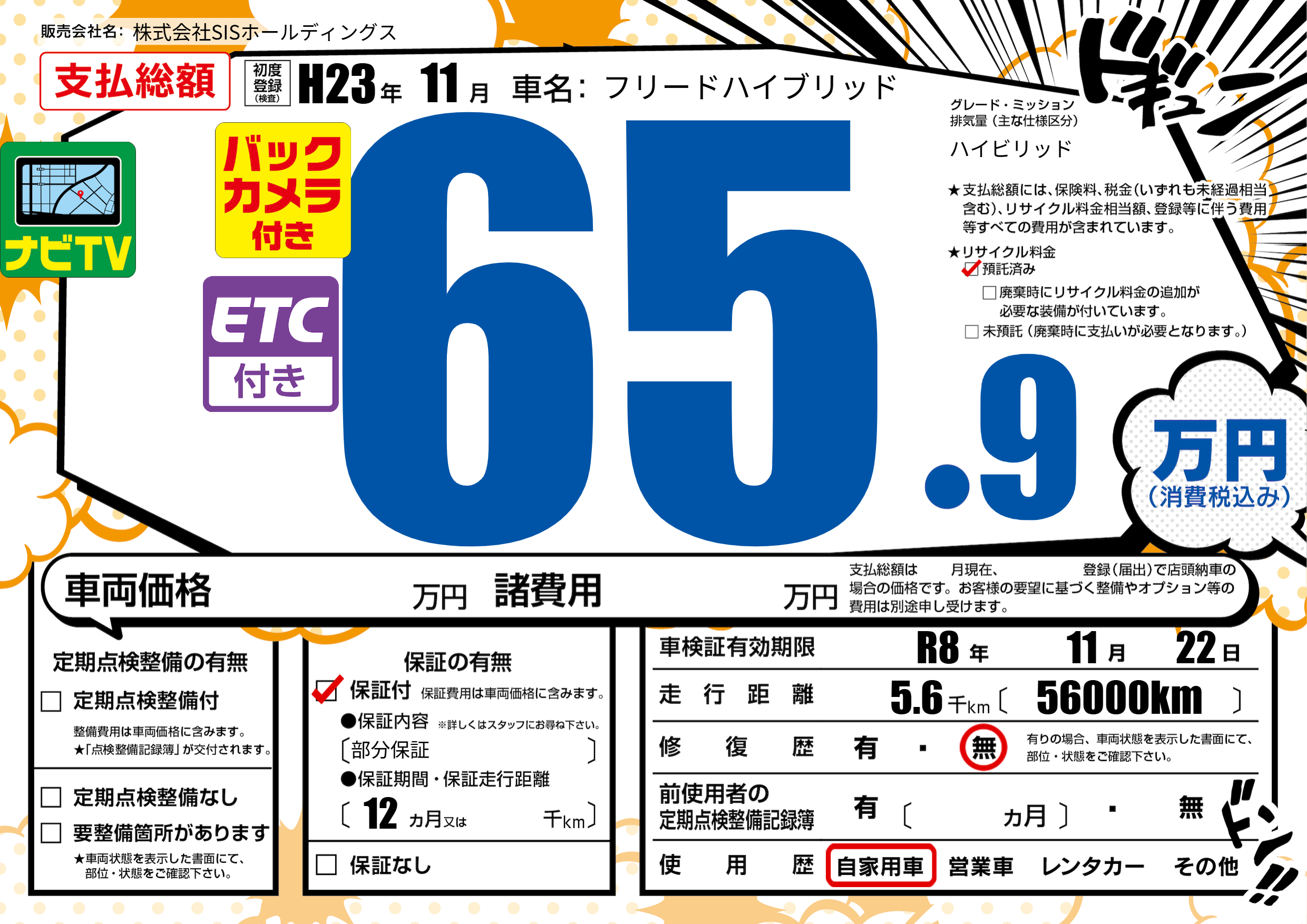 | 走行キロ | 0.5万km | 初年度登録 | H23年11月 |