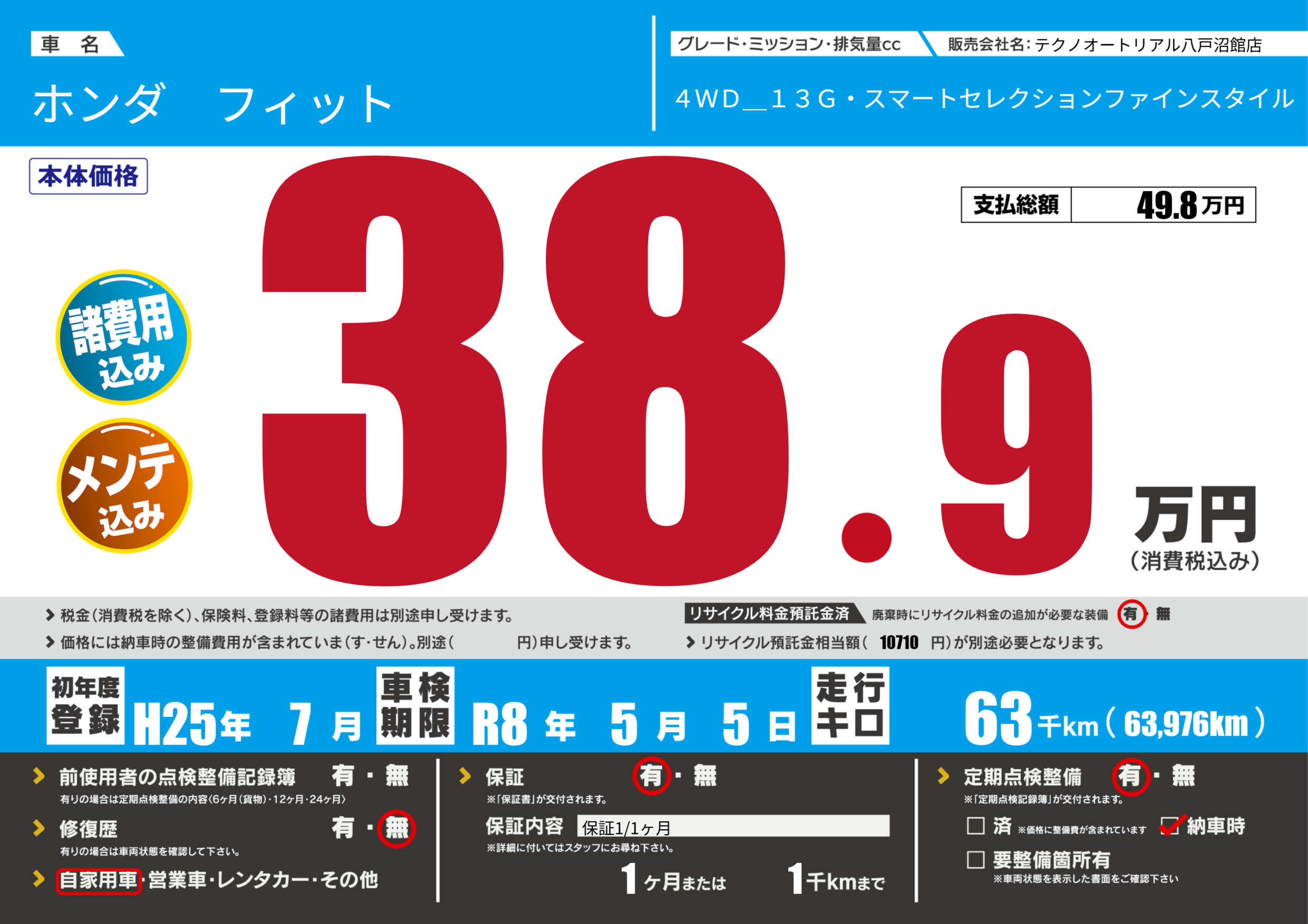 | 走行キロ | 6.3万km | 初年度登録 | H25年7月 |