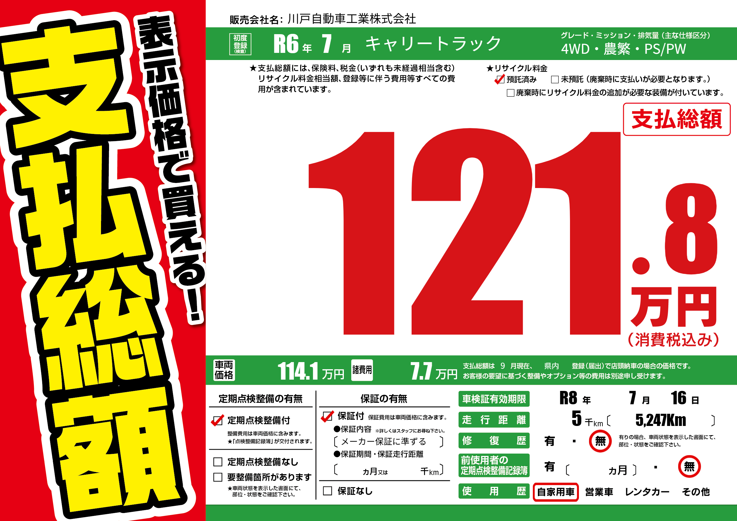 保証付き 保証内容(メーカー保証に準ずる) ヶ月または千km |