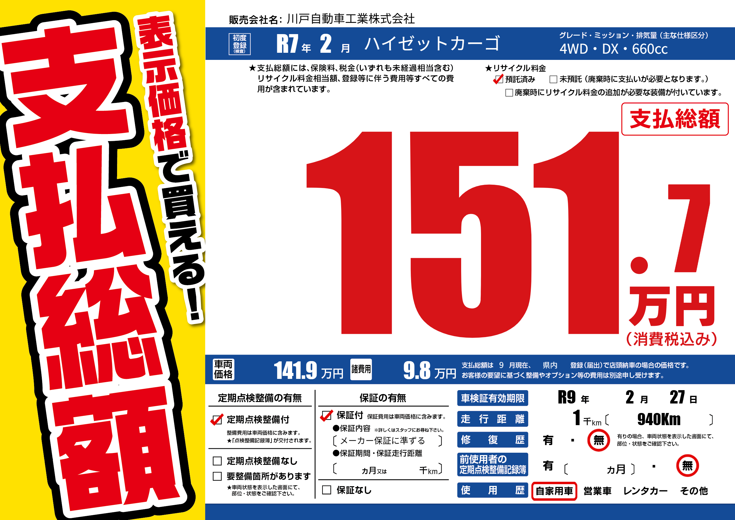 なし | 車検制限 | R9年2月27月 |