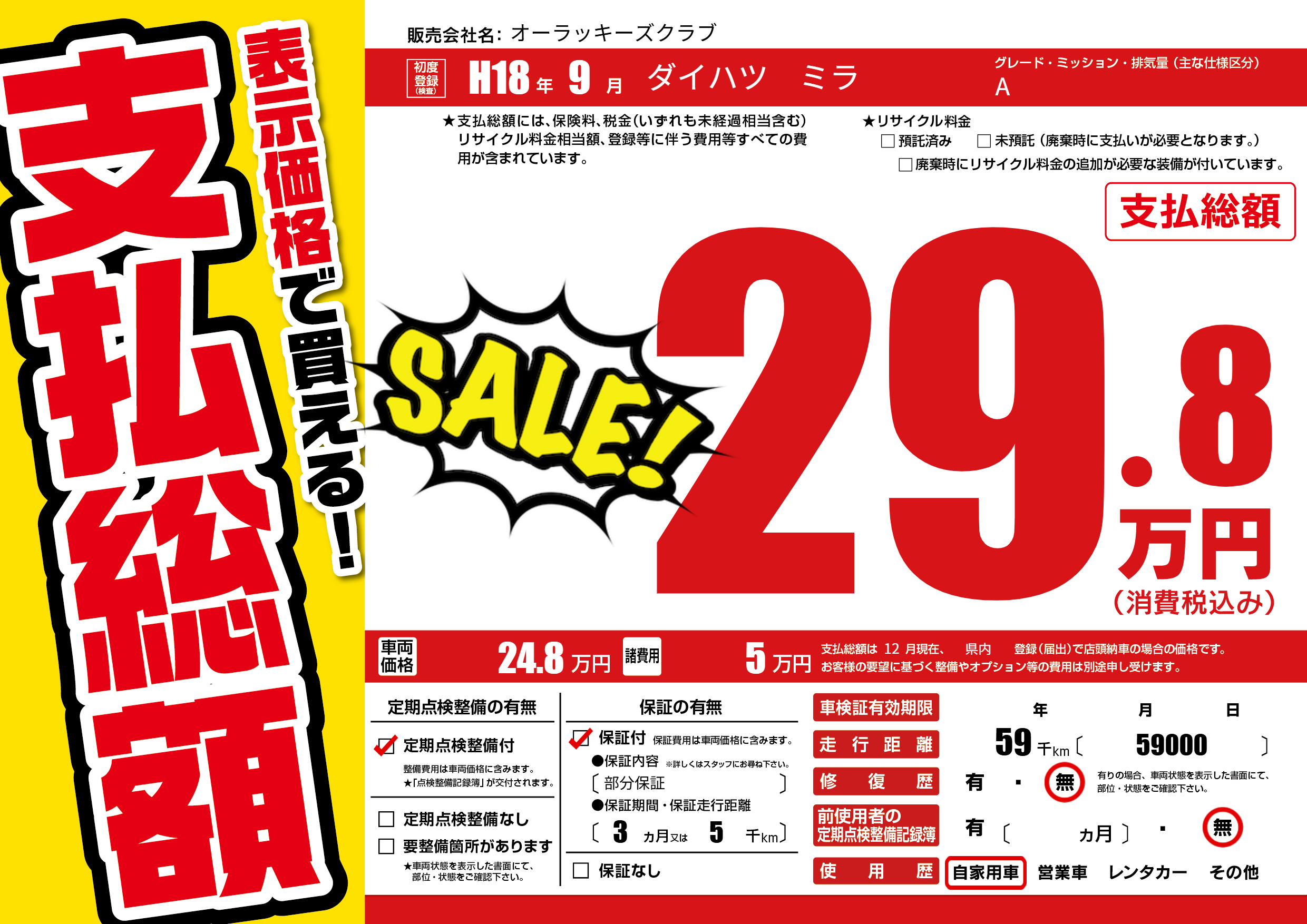 | 走行キロ | 5.9万km | 初年度登録 | H18年9月 |