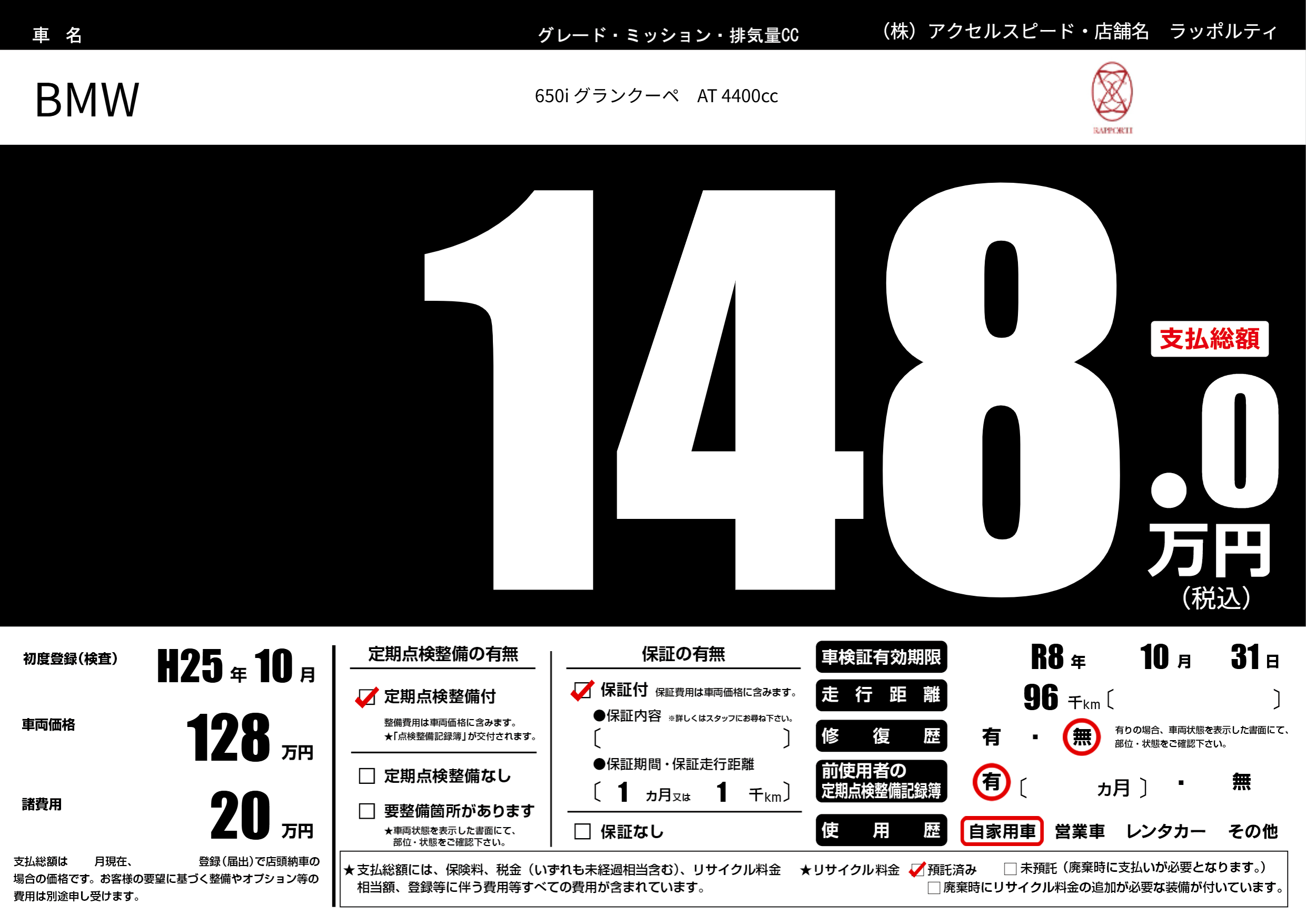 | 走行キロ | 9.6万km | 初年度登録 | H25年10月 |