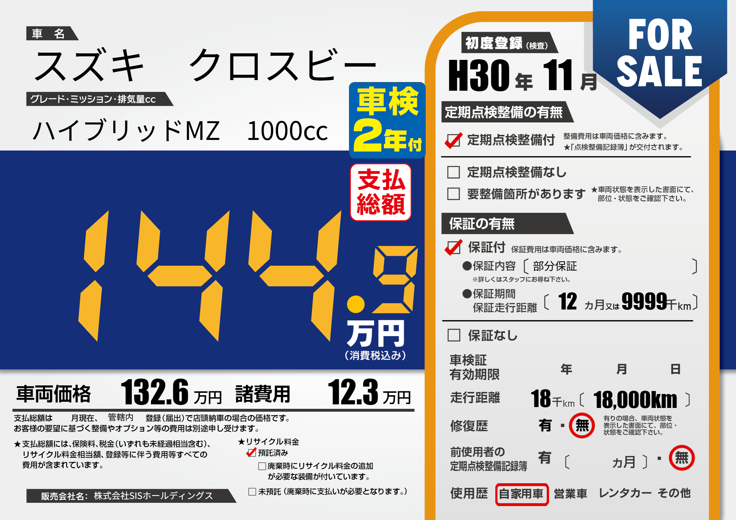 | 走行キロ | 1.8万km | 初年度登録 | H30年11月 |