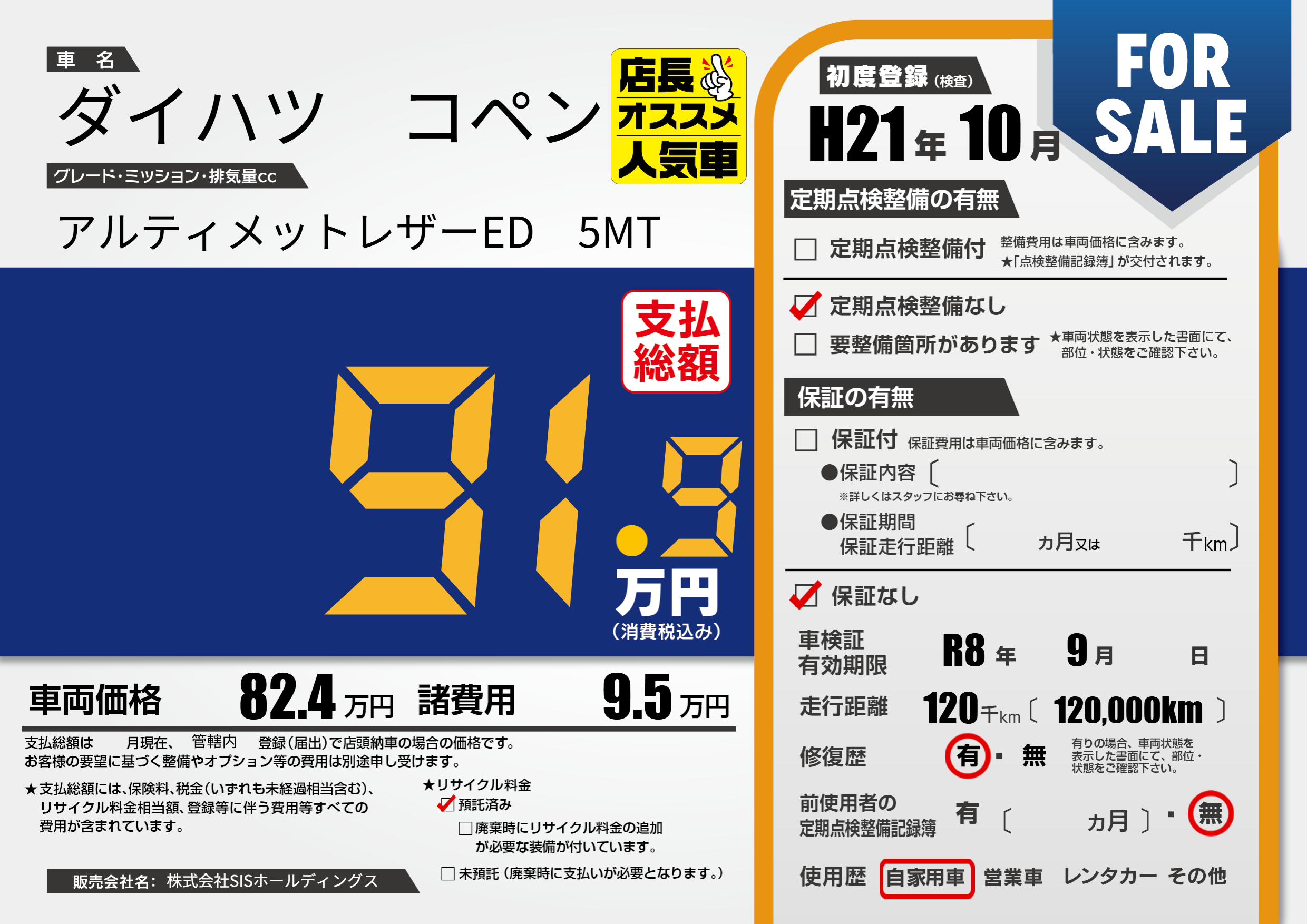 | 車名 | ダイハツ コペン | グレード ミッション 排気量 |