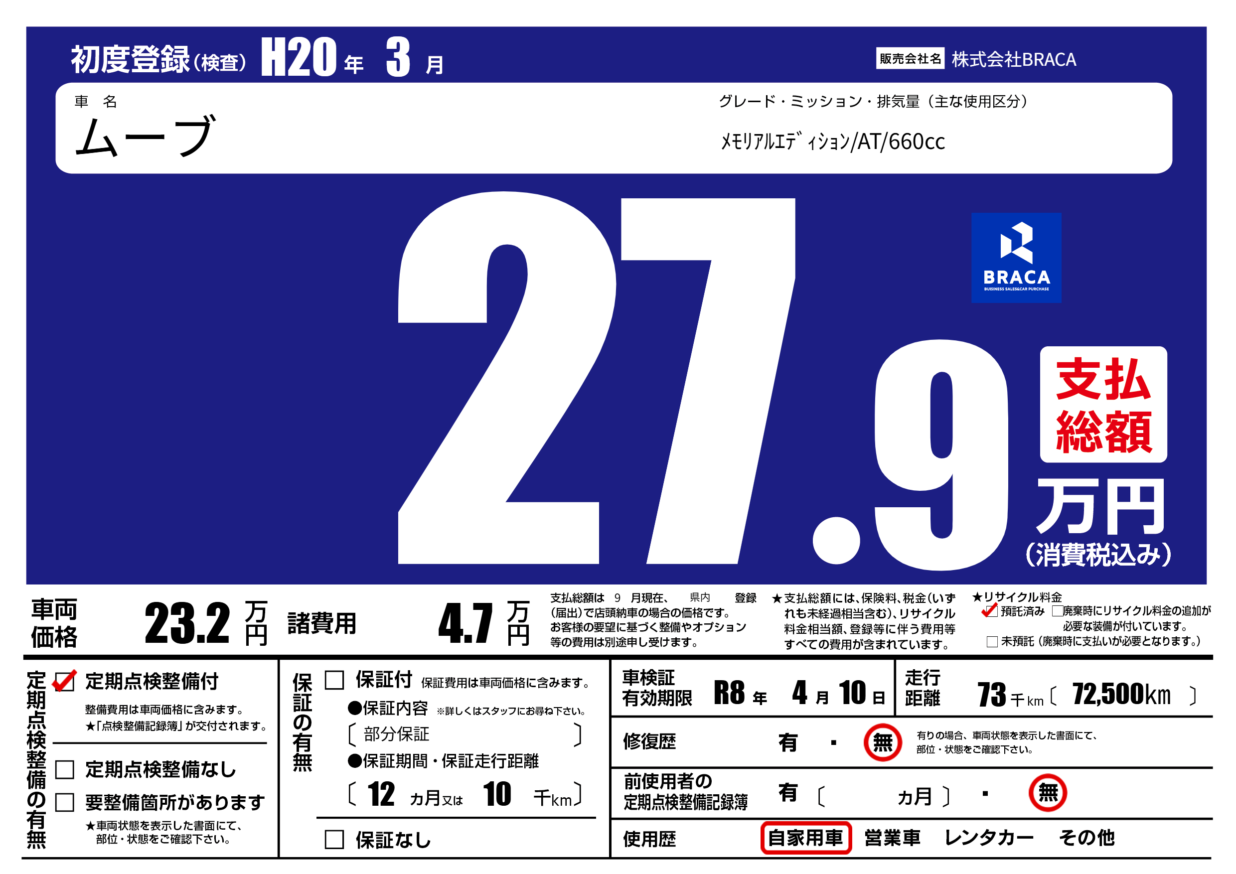 | 車名 | ムーブ | グレード ミッション 排気量 |