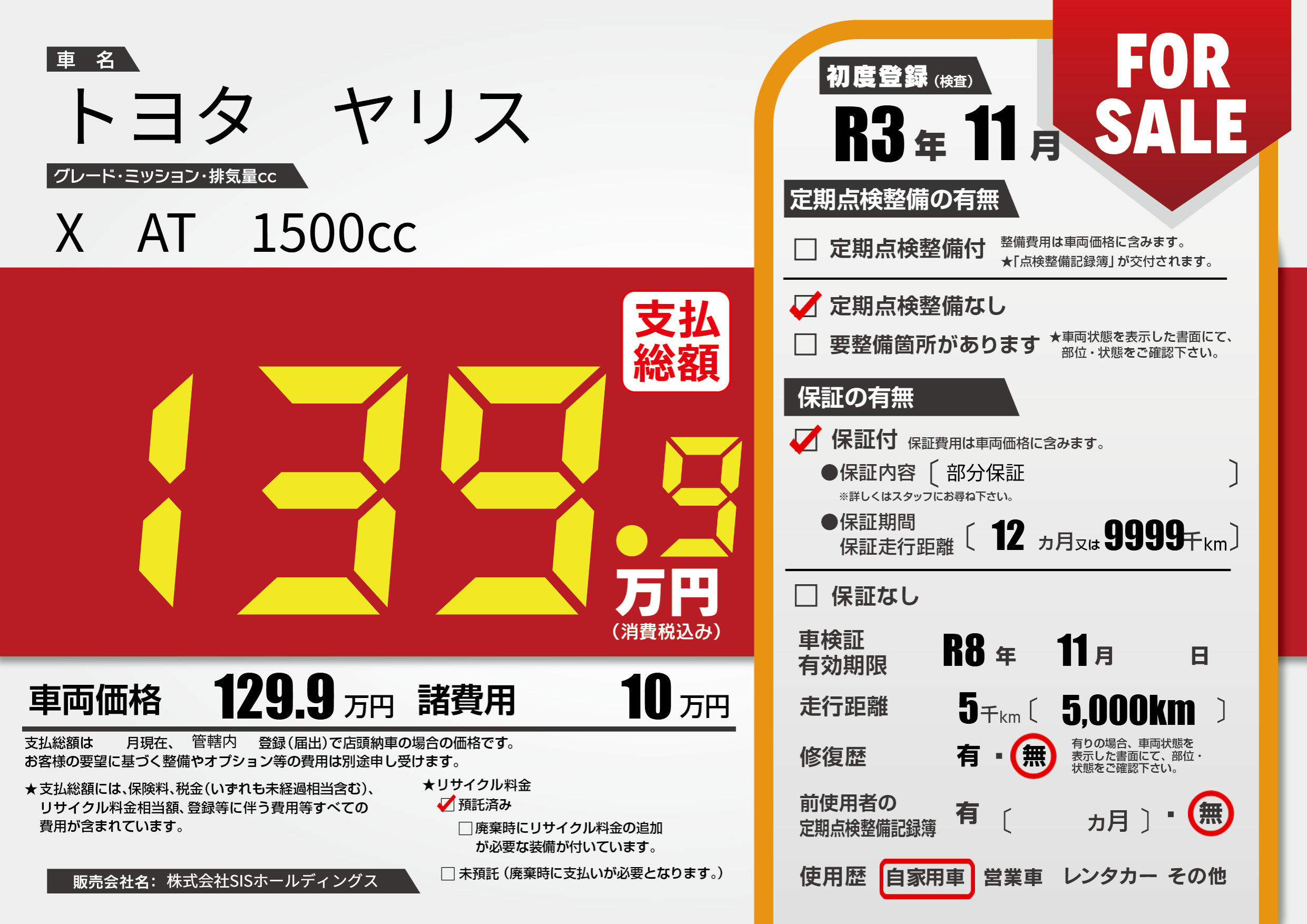 保証付き 保証内容(部分保証) 12ヶ月または(9999)千kmまで |