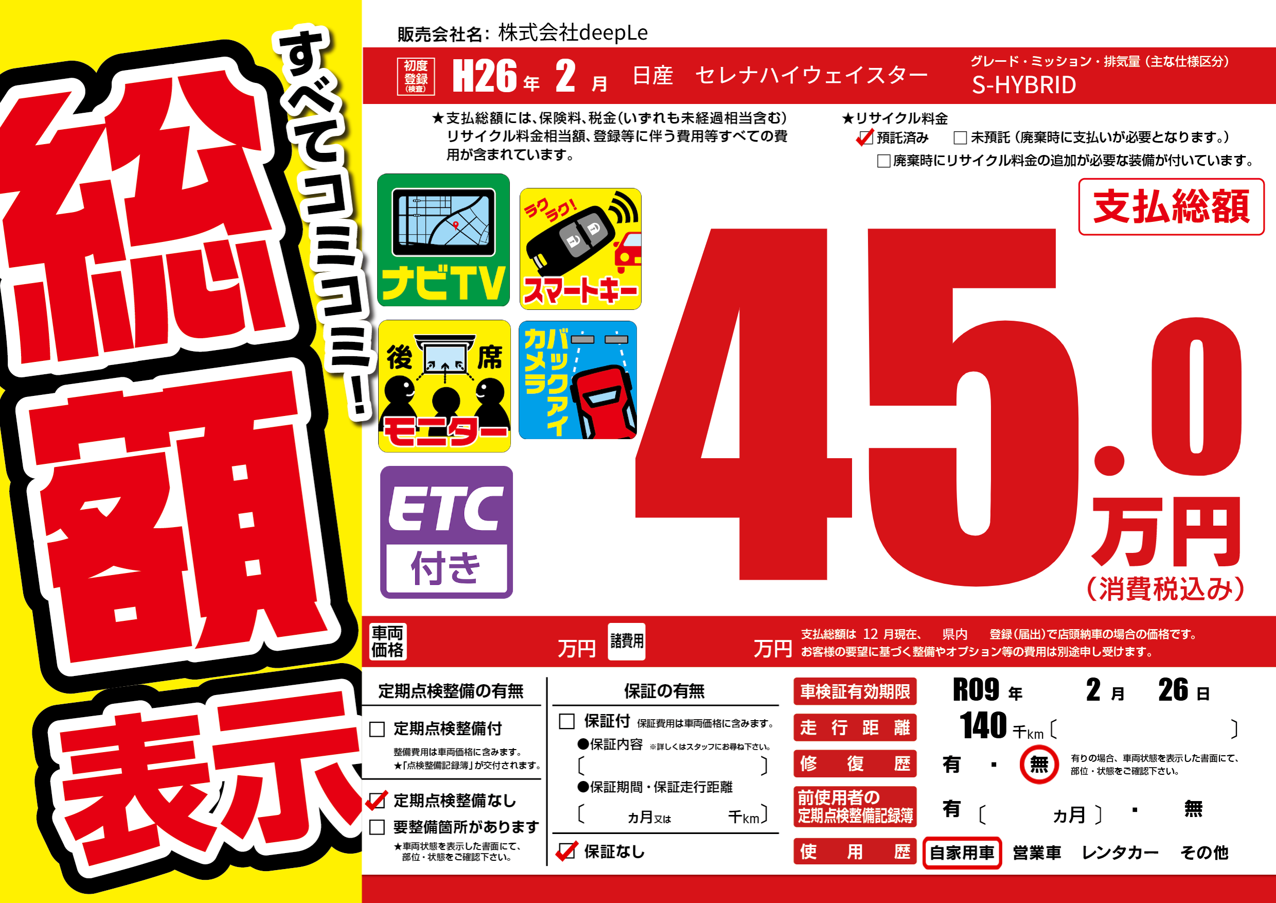 | 走行キロ | 14万km | 初年度登録 | H26年2月 |