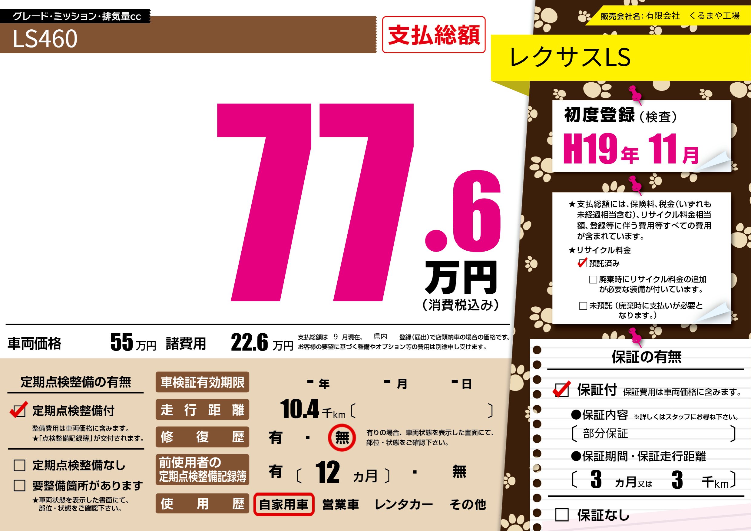 | 車名 | レクサスLS | グレード ミッション 排気量 |