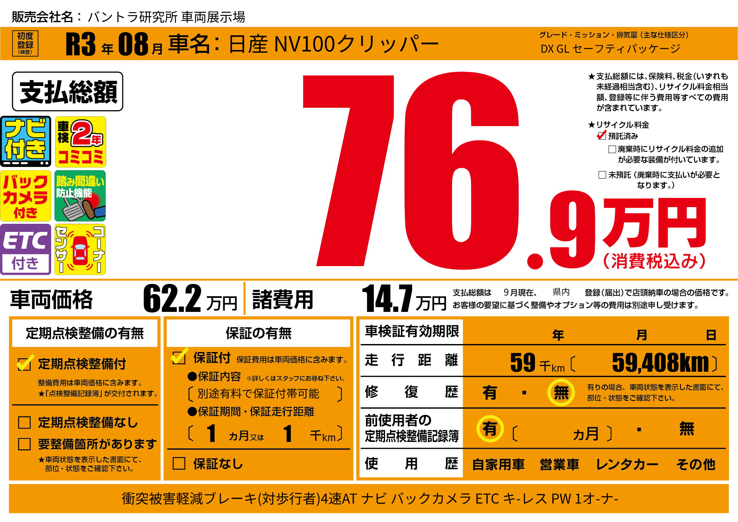 | 車名 | 日産 NV100クリッパー | グレード ミッション 排気量 |