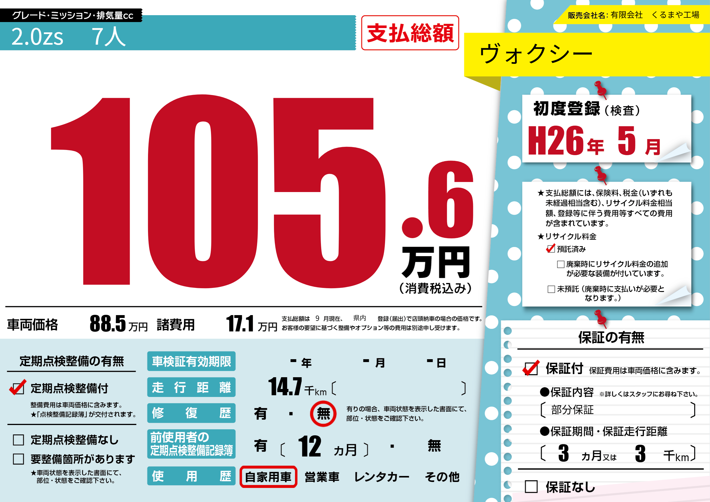 | 車名 | ヴォクシー | グレード ミッション 排気量 |