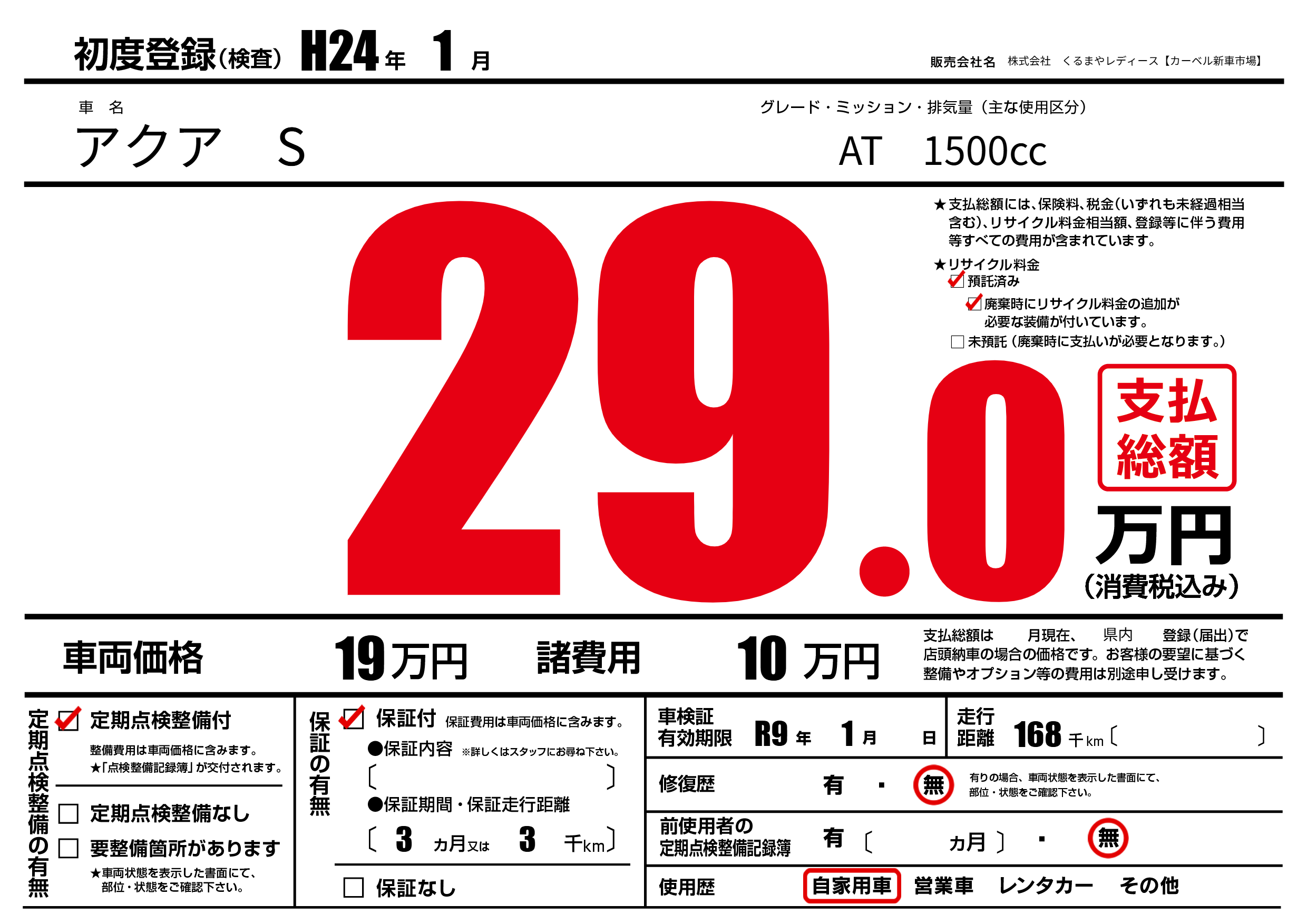 | 車名 | アクア S | グレード ミッション 排気量 |