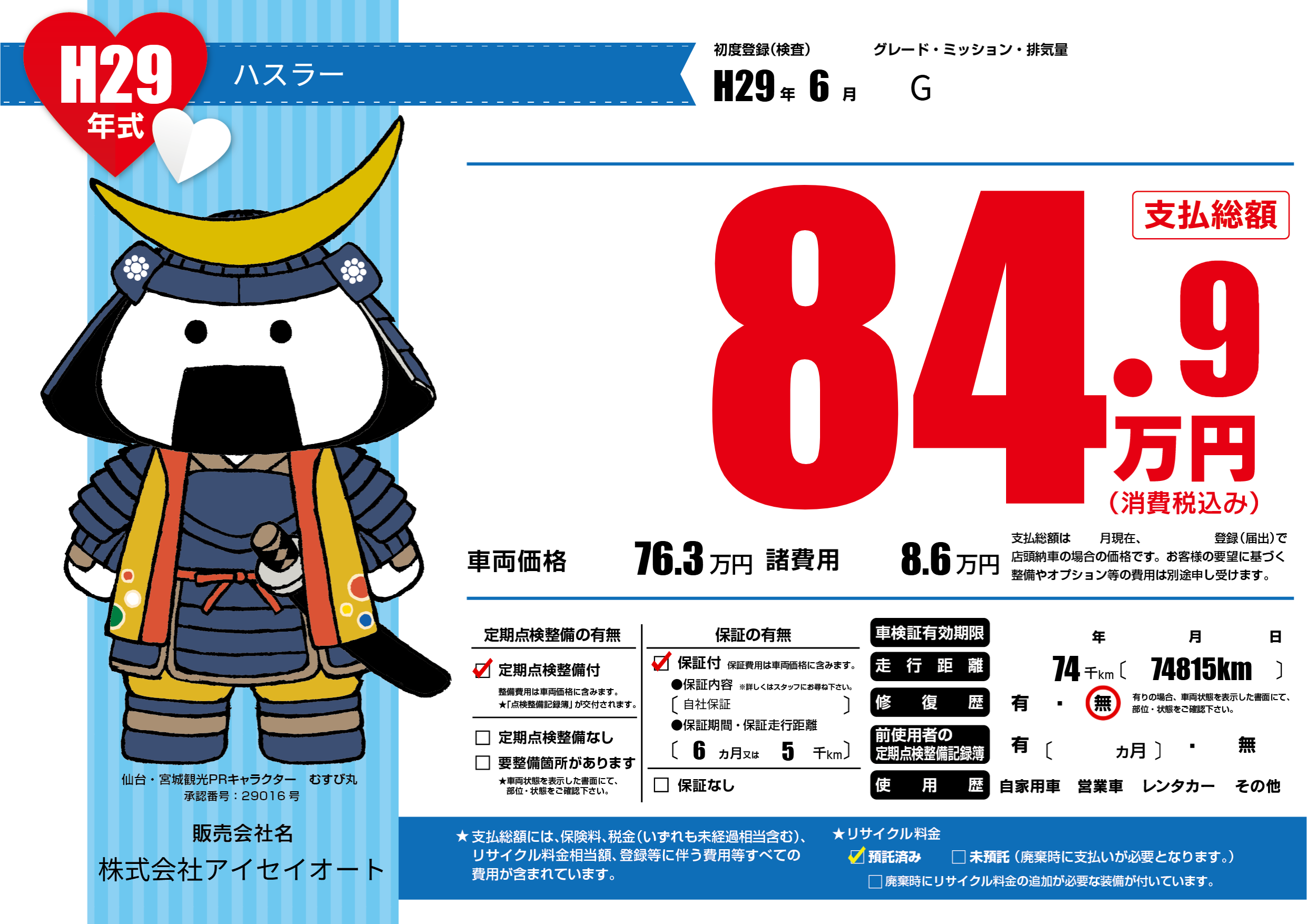 保証付き 保証内容(自社保証) 6ヶ月または(5)千kmまで |