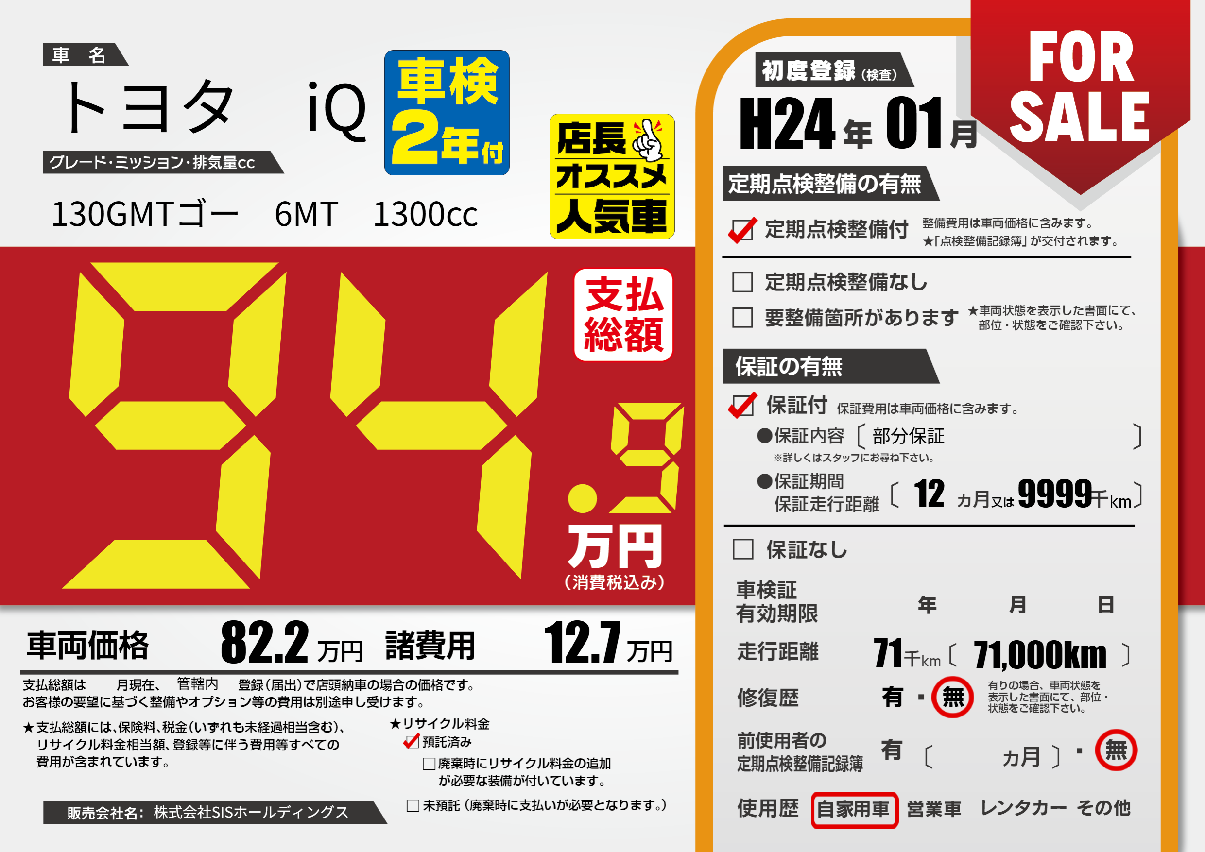 | 車名 | トヨタ iQ | グレード ミッション 排気量 |