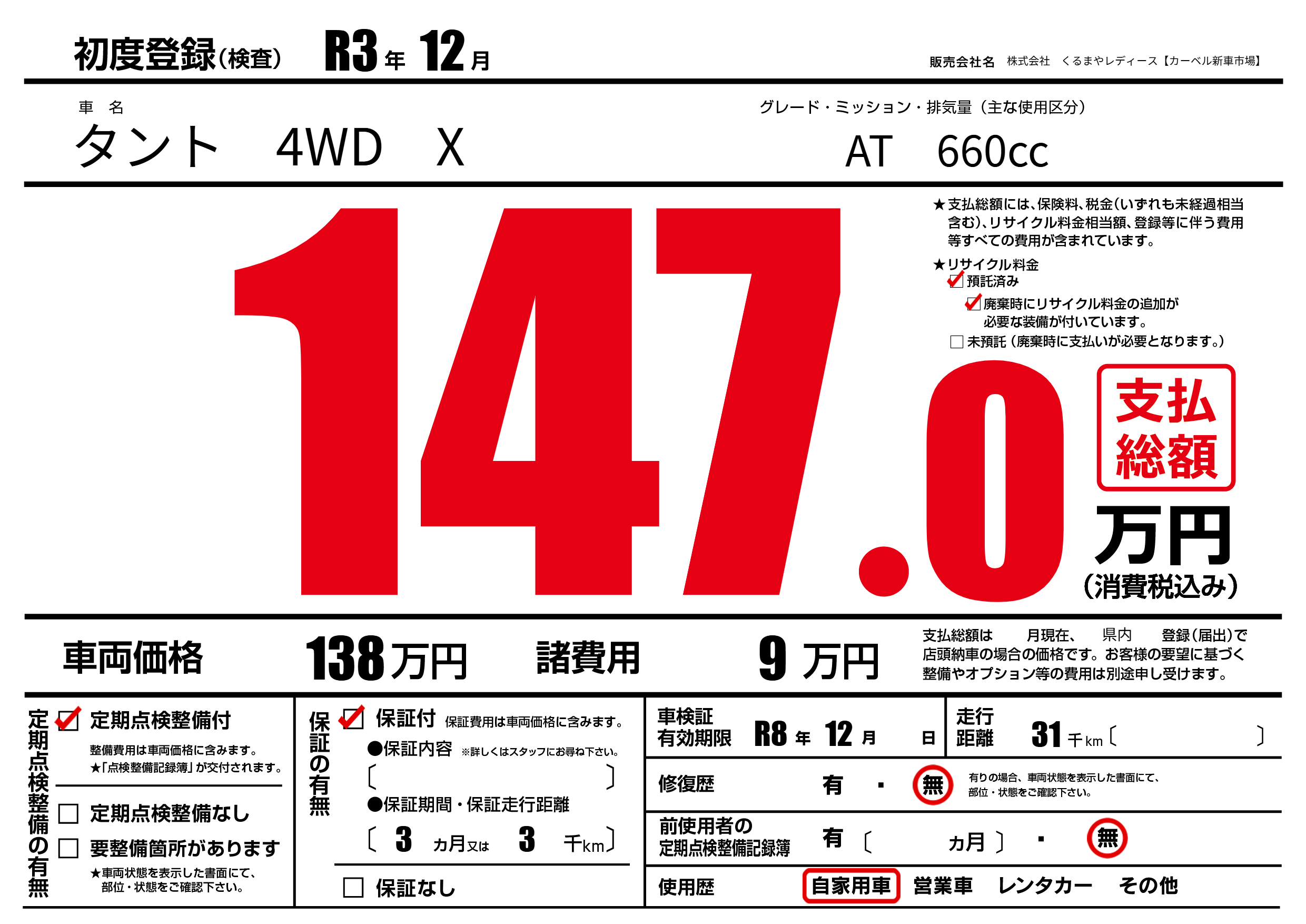| 車名 | タント 4WD X | グレード ミッション 排気量 |