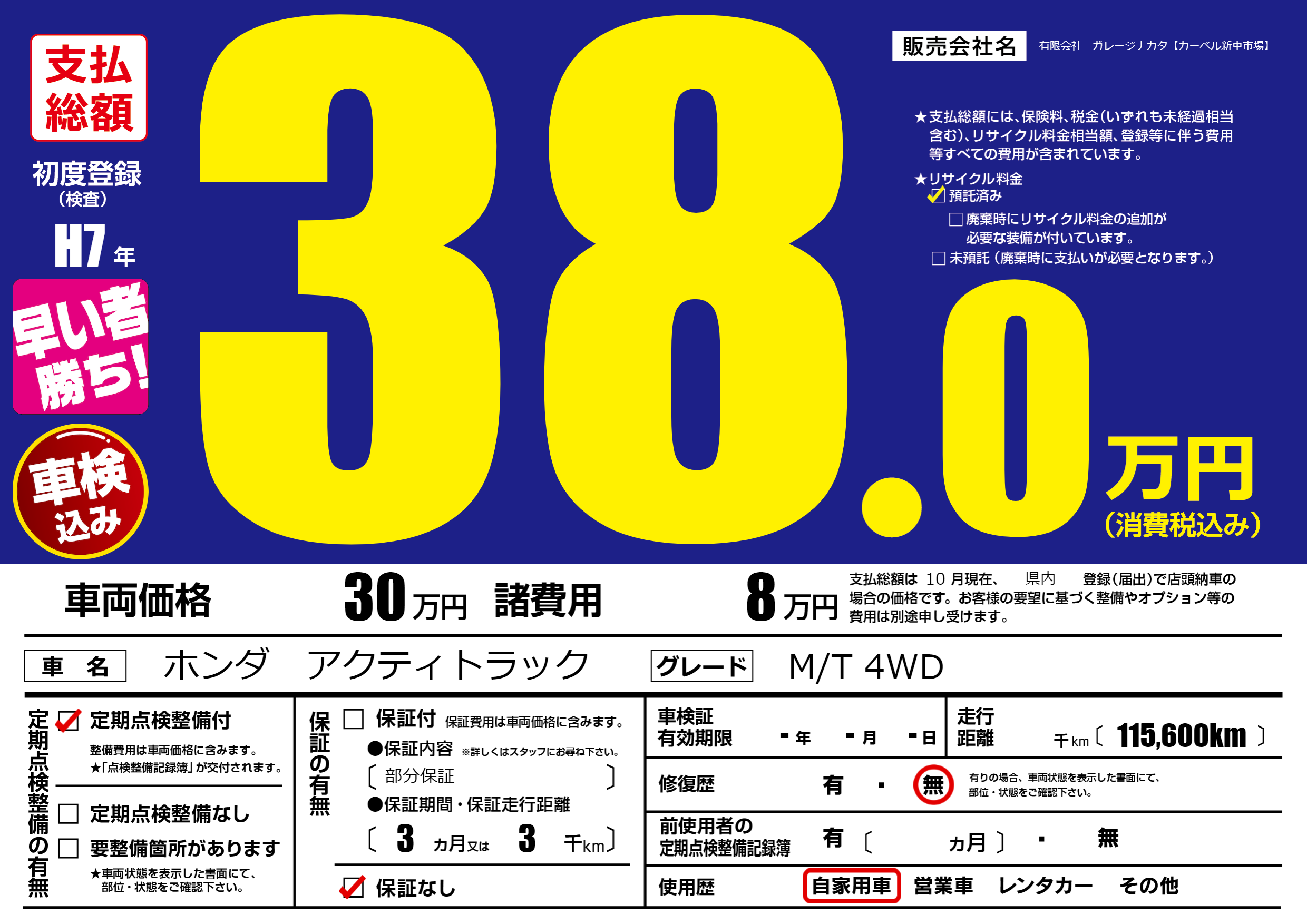 保証なし 保証内容(部分保証) 3ヶ月または(3)千kmまで |
