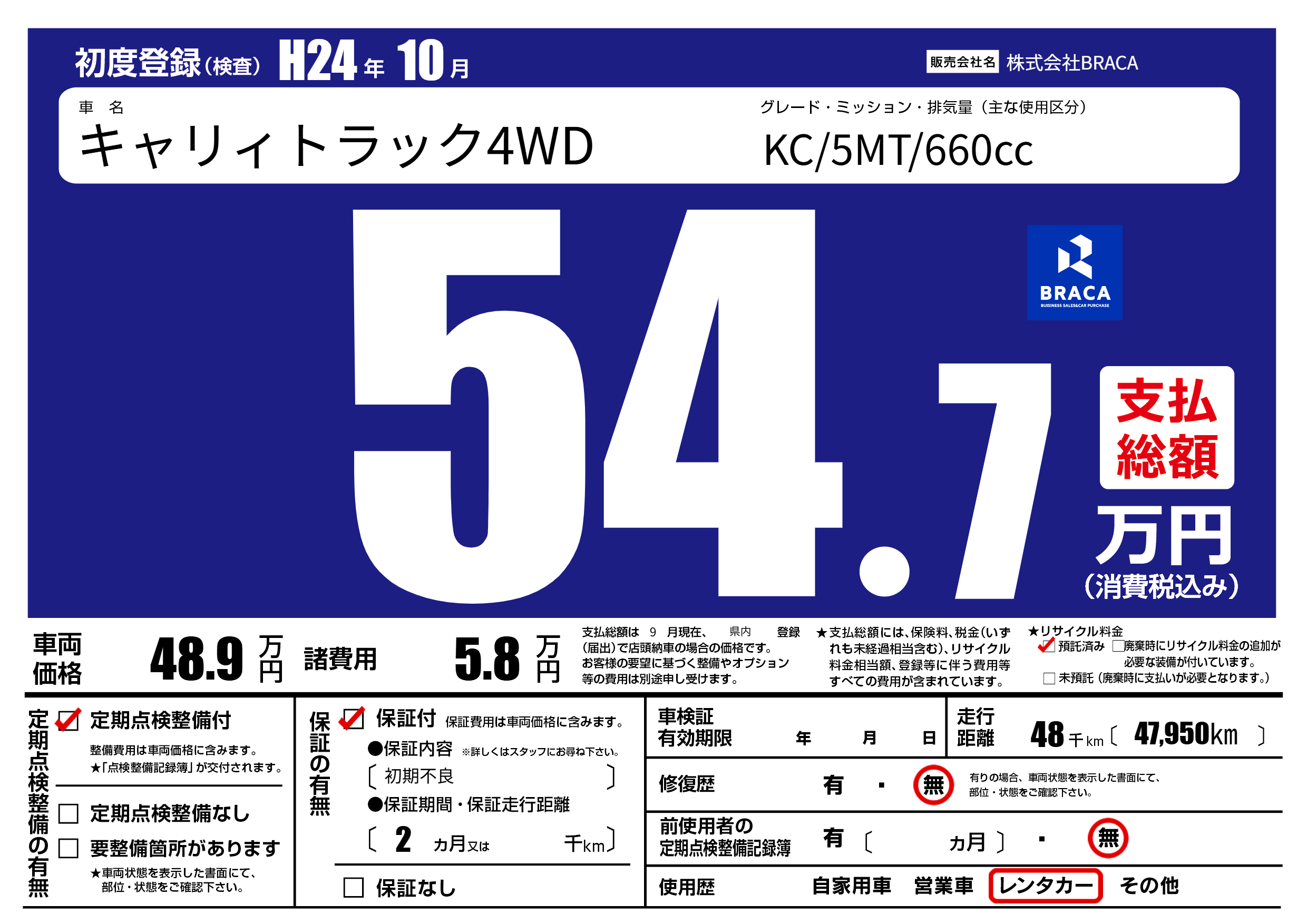 | 走行キロ | 4.8万km | 初年度登録 | H24年10月 |