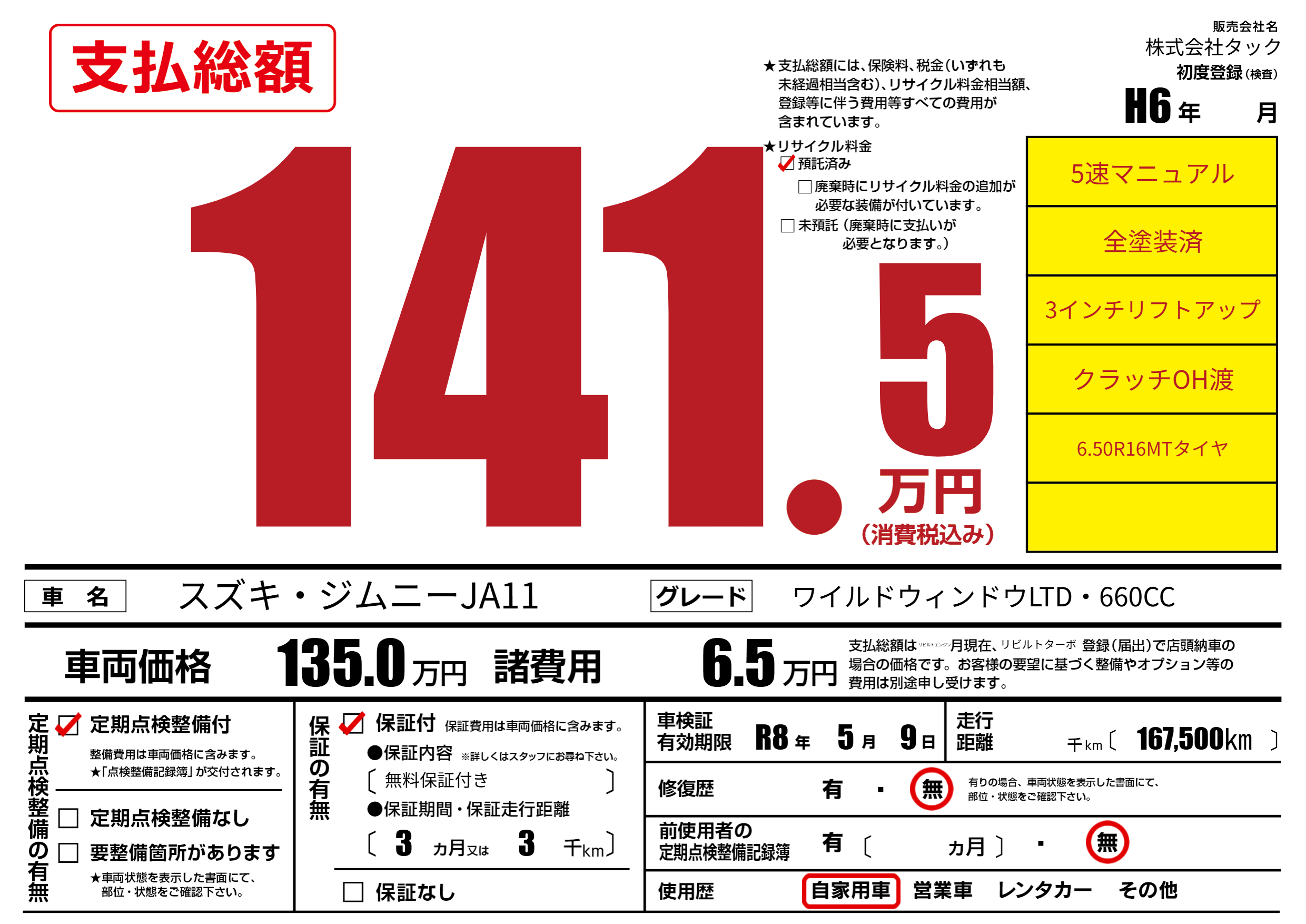 | 車名 | スズキ・ジムニーJA11 | グレード ミッション 排気量 |