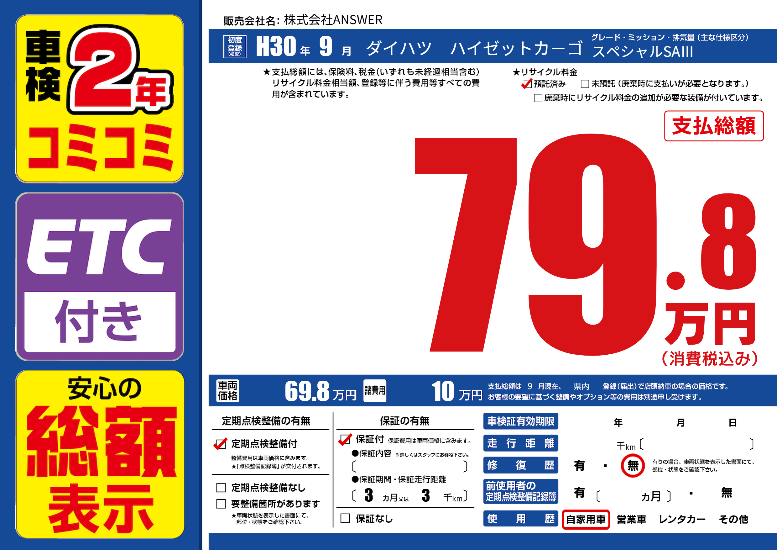 保証付き 保証内容(---) 3ヶ月または(3)千kmまで |