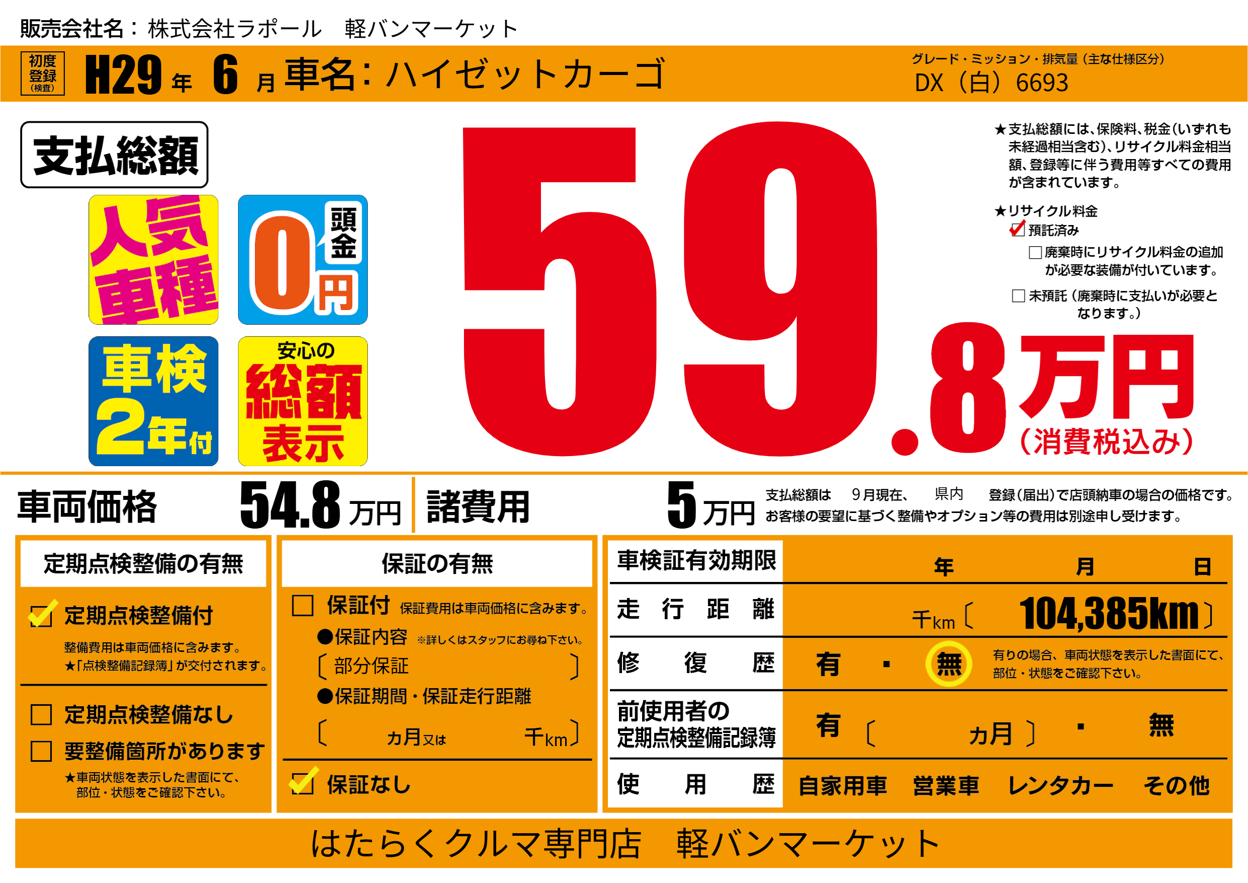 | 車名 | ハイゼットカーゴ | グレード ミッション 排気量 |