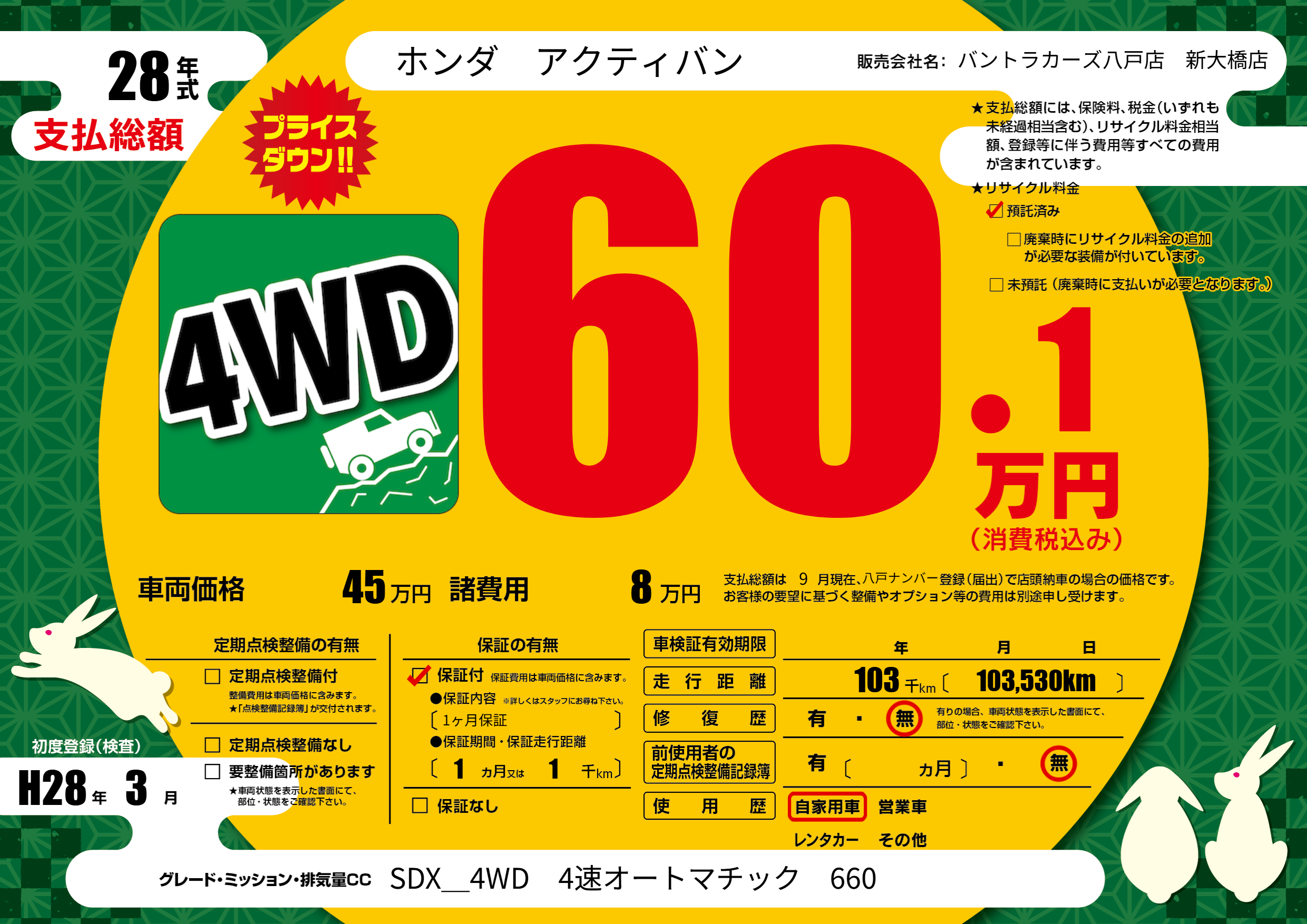| 車名 | ホンダ アクティバン | グレード ミッション 排気量 |